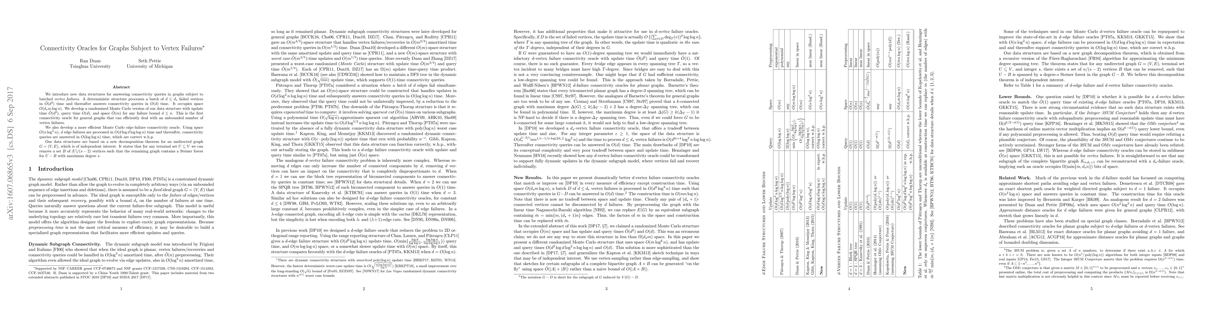 This paper introduces new data structures for efficiently answering connectivity queries in graphs experiencing batched vertex failures. It presents a deterministic structure for handling up to $d_{\star}$ failures and a randomized Monte Carlo version for more flexible failure bounds. Additionally, it develops an efficient edge-failure connectivity oracle, leveraging a novel decomposition theorem for graph connectivity.