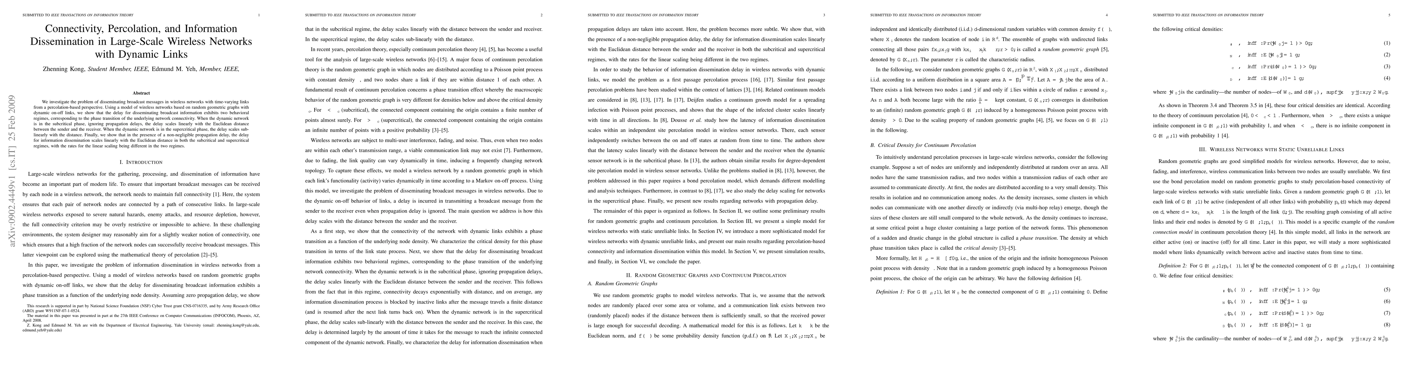 This paper explores information dissemination in wireless networks with dynamic links, revealing two delay regimes based on network connectivity. In the subcritical phase, delay scales linearly with distance, while in the supercritical phase, it scales sub-linearly; however, with propagation delays, both regimes scale linearly but with different rates.