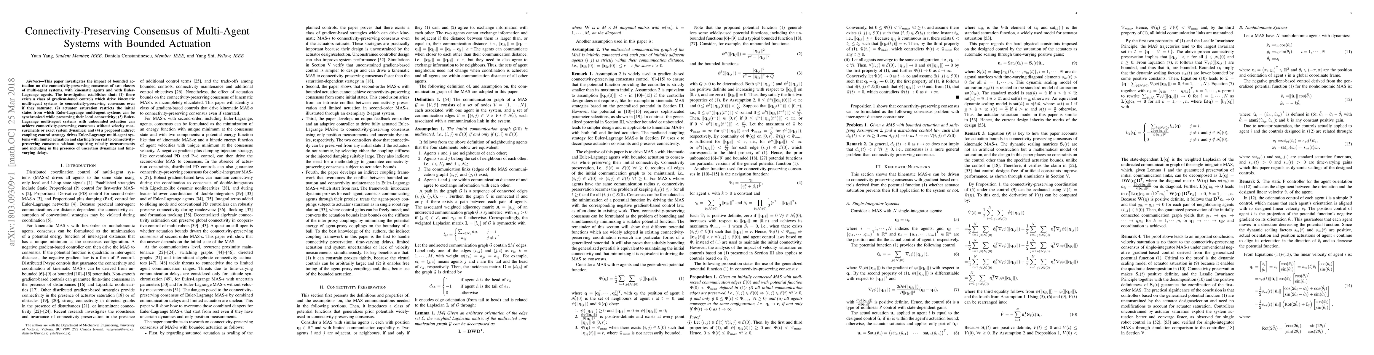 This paper investigates the impact of bounded actuation on the connectivity-preserving consensus of two classes of multi-agent systems, with kinematic agents and with Euler- Lagrange agents. The investigation establishes that: (1) there exists a class of gradient-based controls which drive kinematic multi-agent systems to connectivity-preserving consensus even if they saturate; (2) actuator saturation restricts the initial states from which Euler-Lagrange multi-agent systems can be synchronized while preserving their local connectivity; (3) Euler-Lagrange multi-agent systems with unbounded actuation can achieve connectivity-preserving consensus without velocity measurements or exact system dynamics; and (4) a proposed indirect coupling control strategy drives Euler-Lagrange multi-agent systems with limited actuation and starting from rest to connectivitypreserving consensus without requiring velocity measurements and including in the presence of uncertain dynamics and timevarying delays.