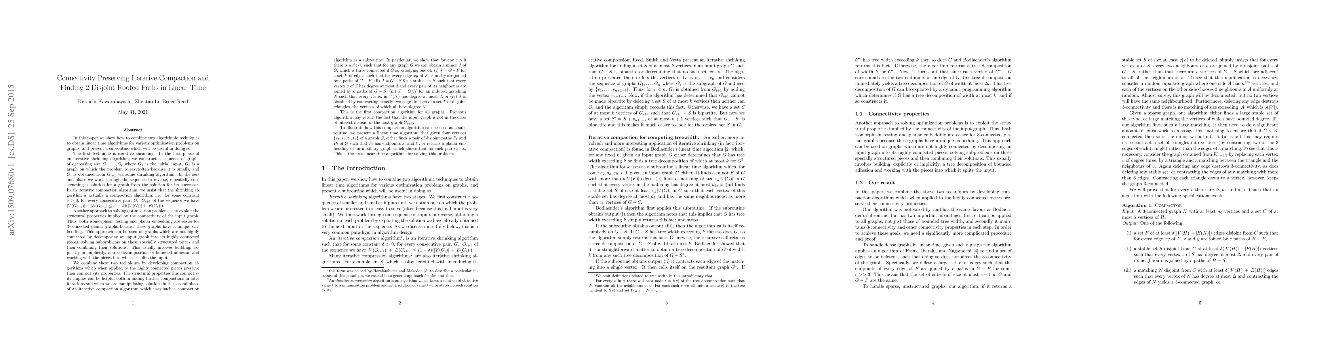 In this paper we show how to combine two algorithmic techniques to obtain linear time algorithms for various optimization problems on graphs, and present a subroutine which will be useful in doing so. The first technique is iterative shrinking. In the first phase of an iterative shrinking algorithm, we construct a sequence of graphs of decreasing size $G_1,\ldots,G_\ell$ where $G_1$ is the initial input, $G_\ell$ is a graph on which the problem is easy, and $G_i$ is obtained from $G_{i+1}$ via some shrinking algorithm. In the second phase we work through the sequence in reverse, repeatedly constructing a solution for a graph from the solution for its successor. In an iterative compaction algorithm, we insist that the graphs decrease by a constant fraction of the entire graph. Another approach to solving optimization problems is to exploit the structural properties implied by the connectivity of the input graph. This approach can be used on graphs which are not highly connected by decomposing an input graph into its highly connected pieces, solving subproblems on these specially structured pieces and then combining their solutions. We combine these two techniques by developing compaction algorithms which when applied to the highly connected pieces preserve their connectivity properties. The structural properties this connectivity implies can be helpful both in finding further compactions in later iterations and when we are manipulating solutions in the second phase of an iterative compaction algorithm. To illustrate how this compaction algorithm can be used as a subroutine, we present a linear time algorithm that given four vertices $\{s_1,s_2,t_1,t_2\}$ of a graph $G$, either finds a pair of disjoint paths $P_1$ and $P_2$ of $G$ such that $P_i$ has endpoints $s_i$ and $t_i$, or returns a planar embedding of an auxiliary graph which shows that no such pair exists.