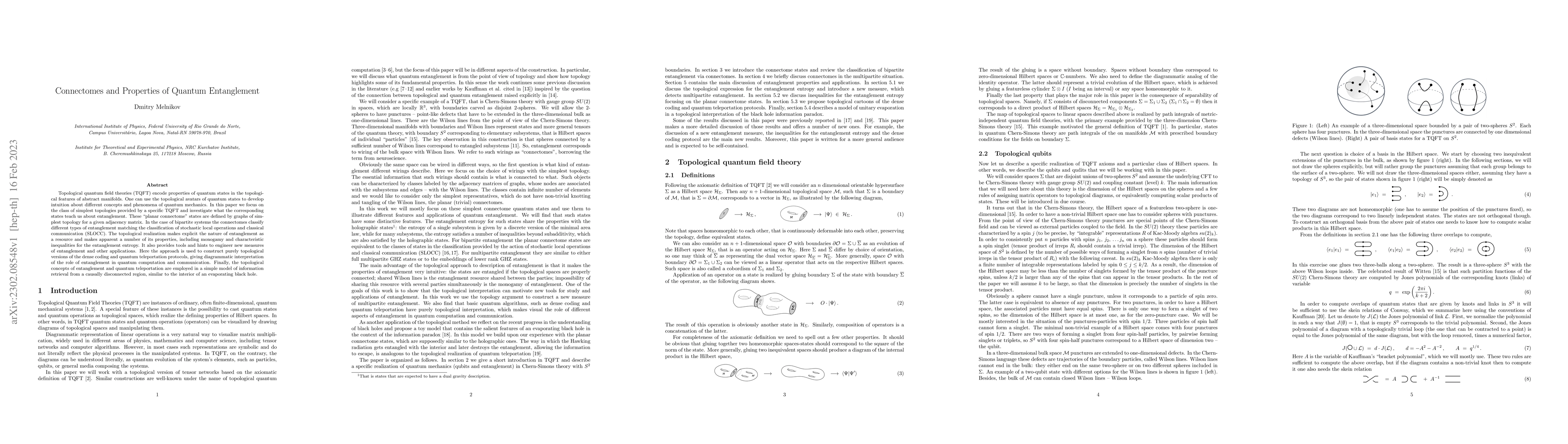 This paper explores the use of topological quantum field theories to understand quantum entanglement through the concept of "planar connectome" states, revealing insights into entanglement's properties like monogamy and providing new measures. It also constructs topological versions of dense coding and quantum teleportation, and applies these concepts to a model of information retrieval in black hole physics.
