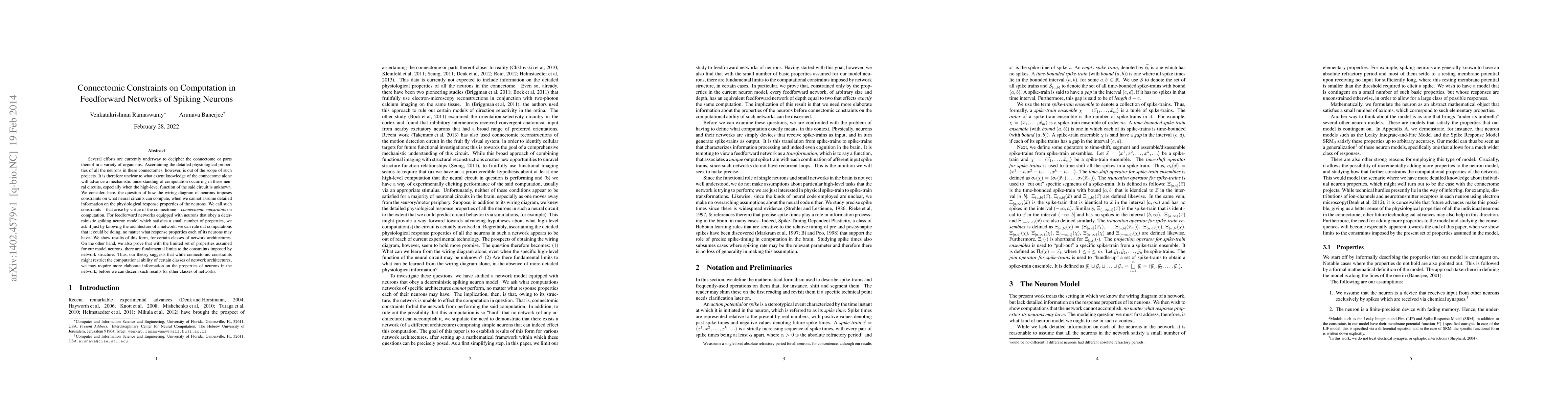 Several efforts are currently underway to decipher the connectome or parts thereof in a variety of organisms. Ascertaining the detailed physiological properties of all the neurons in these connectomes, however, is out of the scope of such projects. It is therefore unclear to what extent knowledge of the connectome alone will advance a mechanistic understanding of computation occurring in these neural circuits, especially when the high-level function of the said circuit is unknown. We consider, here, the question of how the wiring diagram of neurons imposes constraints on what neural circuits can compute, when we cannot assume detailed information on the physiological response properties of the neurons. We call such constraints -- that arise by virtue of the connectome -- connectomic constraints on computation. For feedforward networks equipped with neurons that obey a deterministic spiking neuron model which satisfies a small number of properties, we ask if just by knowing the architecture of a network, we can rule out computations that it could be doing, no matter what response properties each of its neurons may have. We show results of this form, for certain classes of network architectures. On the other hand, we also prove that with the limited set of properties assumed for our model neurons, there are fundamental limits to the constraints imposed by network structure. Thus, our theory suggests that while connectomic constraints might restrict the computational ability of certain classes of network architectures, we may require more elaborate information on the properties of neurons in the network, before we can discern such results for other classes of networks.