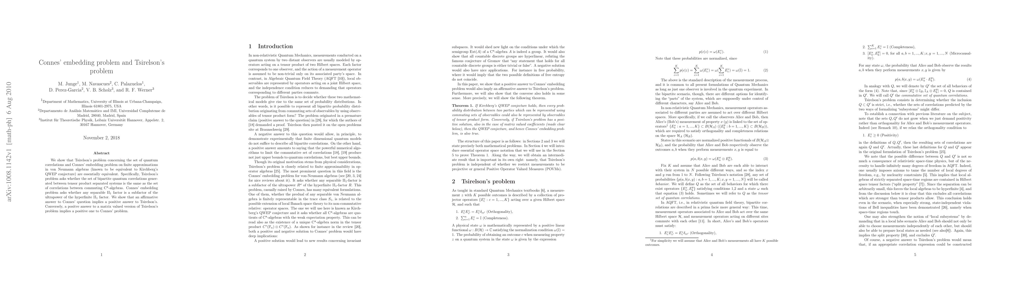 This paper demonstrates the equivalence between Tsirelson's problem on quantum correlations and Connes' embedding problem in von Neumann algebras, showing that solving one implies solving the other. Specifically, it connects the generation of quantum correlations between separated systems to the subfactor inclusion in separable II$_1$ factors.