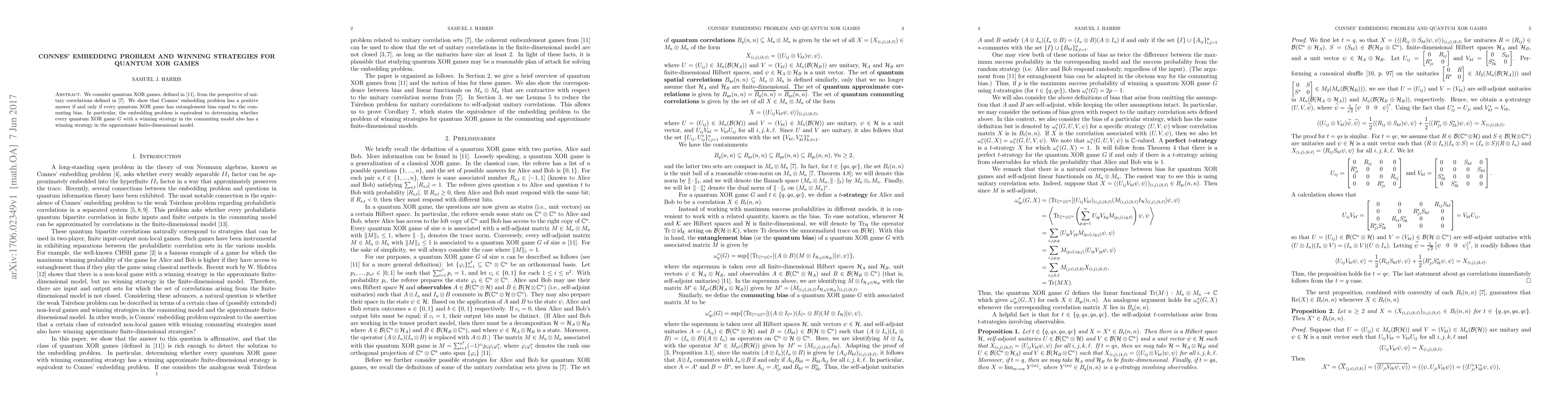 Summary: This paper establishes a connection between Connes' embedding problem and quantum XOR games, proving that the embedding problem has a positive solution if and only if all quantum XOR games with a winning strategy in the commuting model also have a winning strategy in the approximate finite-dimensional model.