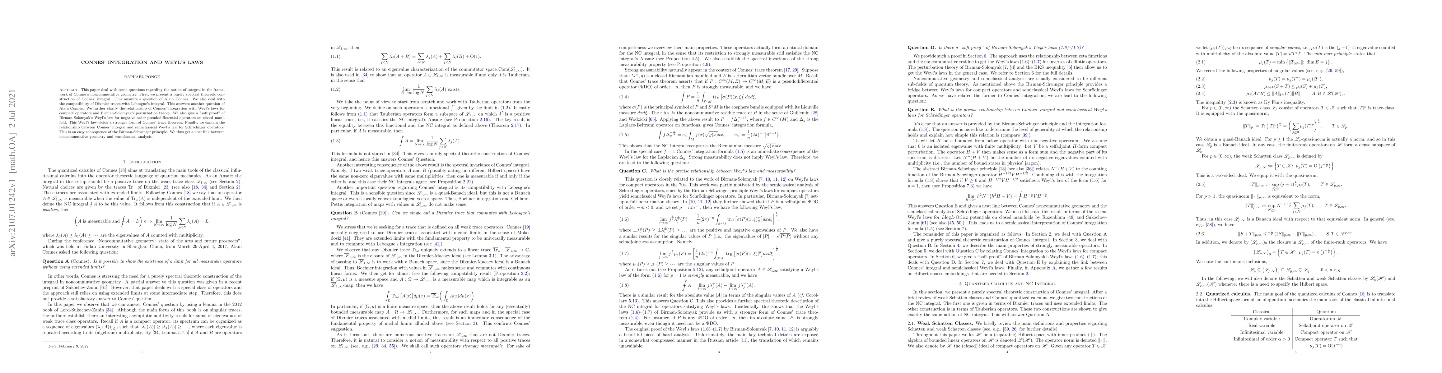 This paper deal with some questions regarding the notion of integral in the framework of Connes's noncommutative geometry. First, we present a purely spectral theoretic construction of Connes' integral. This answers a question of Alain Connes. We also deal with the compatibility of Dixmier traces with Lebesgue's integral. This answers another question of Alain Connes. We further clarify the relationship of Connes' integration with Weyl's laws for compact operators and Birman-Solomyak's perturbation theory. We also give a "soft proof" of Birman-Solomyak's Weyl's law for negative order pseudodifferential operators on closed manifold. This Weyl's law yields a stronger form of Connes' trace theorem. Finally, we explain the relationship between Connes' integral and semiclassical Weyl's law for Schroedinger operators. This is an easy consequence of the Birman-Schwinger principle. We thus get a neat link between noncommutative geometry and semiclassical analysis.