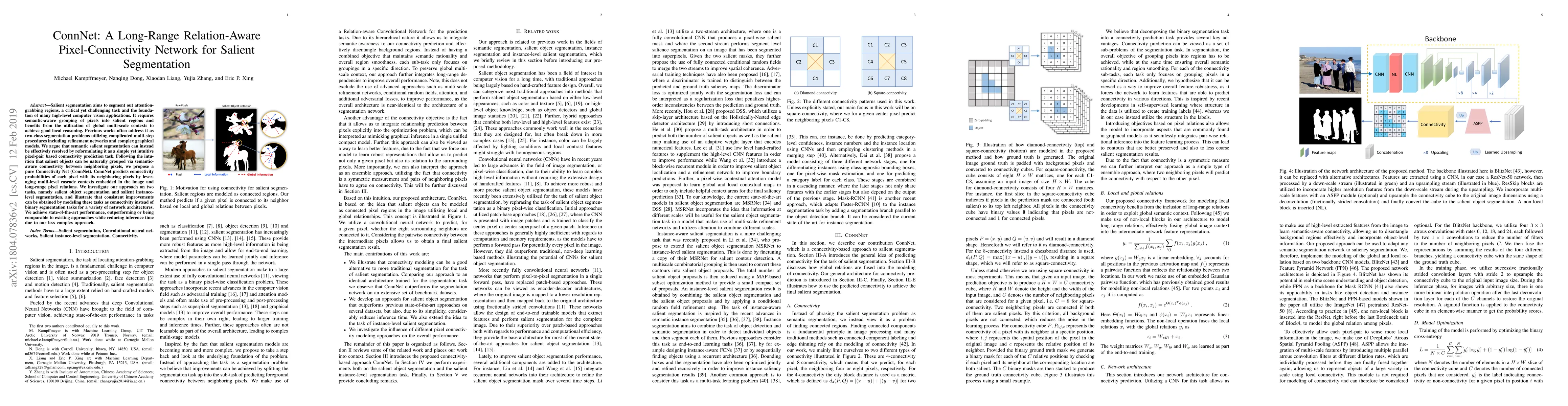 Salient segmentation aims to segment out attention-grabbing regions, a critical yet challenging task and the foundation of many high-level computer vision applications. It requires semantic-aware grouping of pixels into salient regions and benefits from the utilization of global multi-scale contexts to achieve good local reasoning. Previous works often address it as two-class segmentation problems utilizing complicated multi-step procedures including refinement networks and complex graphical models. We argue that semantic salient segmentation can instead be effectively resolved by reformulating it as a simple yet intuitive pixel-pair based connectivity prediction task. Following the intuition that salient objects can be naturally grouped via semantic-aware connectivity between neighboring pixels, we propose a pure Connectivity Net (ConnNet). ConnNet predicts connectivity probabilities of each pixel with its neighboring pixels by leveraging multi-level cascade contexts embedded in the image and long-range pixel relations. We investigate our approach on two tasks, namely salient object segmentation and salient instance-level segmentation, and illustrate that consistent improvements can be obtained by modeling these tasks as connectivity instead of binary segmentation tasks for a variety of network architectures. We achieve state-of-the-art performance, outperforming or being comparable to existing approaches while reducing inference time due to our less complex approach.