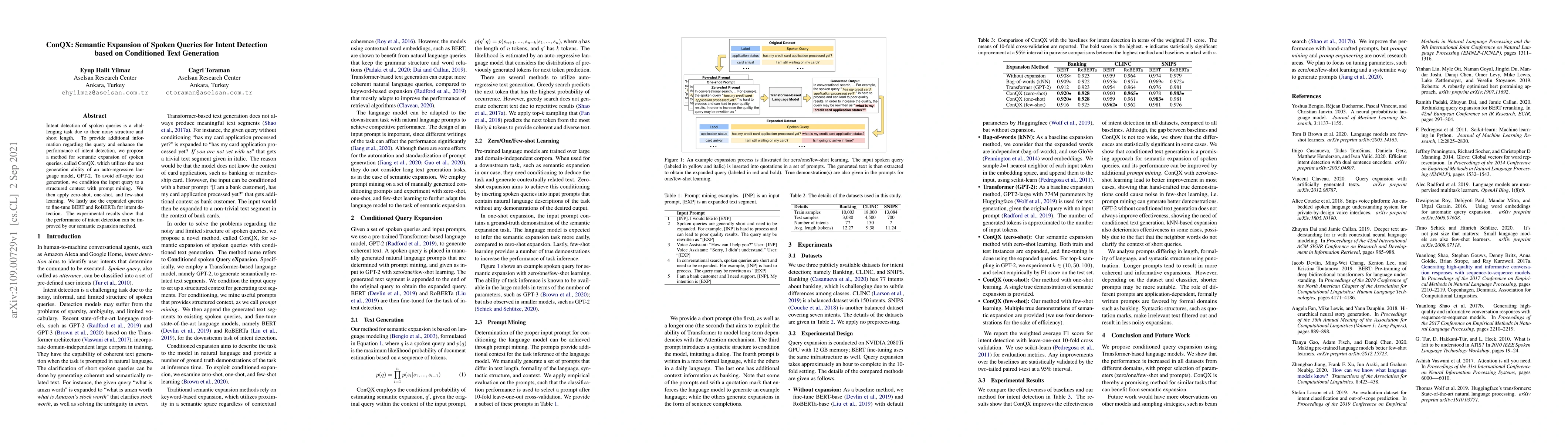 The paper proposes ConQX, a method for semantically expanding spoken queries using GPT-2 conditioned by structured context, to enhance intent detection. The expanded queries are used to fine-tune BERT and RoBERTa, resulting in improved intent detection performance.