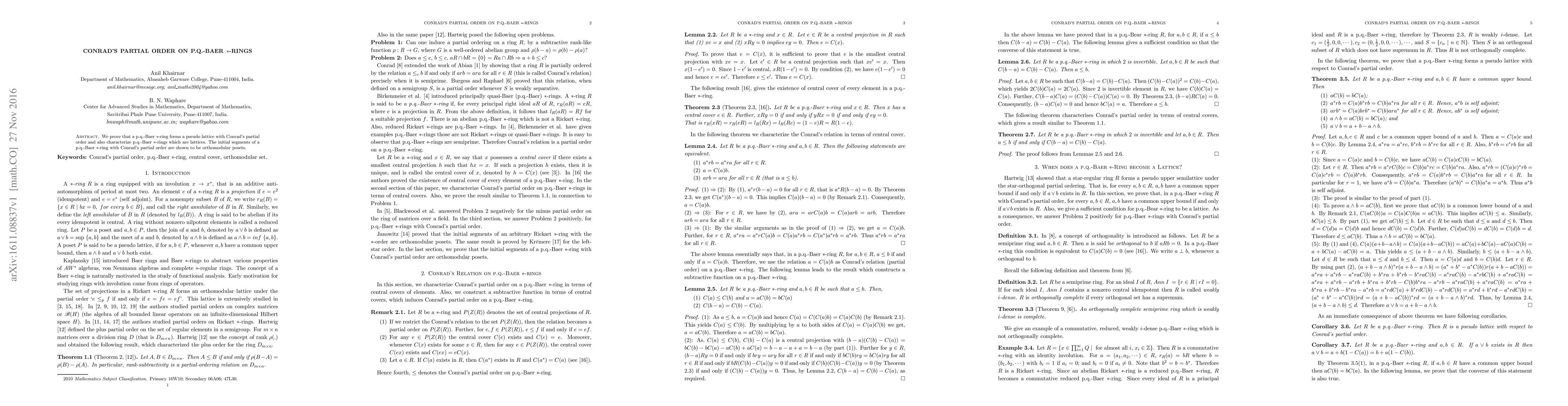 The paper establishes a new characterization of p.q.-Baer *-rings under Conrad's partial order, proving they form a pseudo lattice and their initial segments are orthomodular posets.