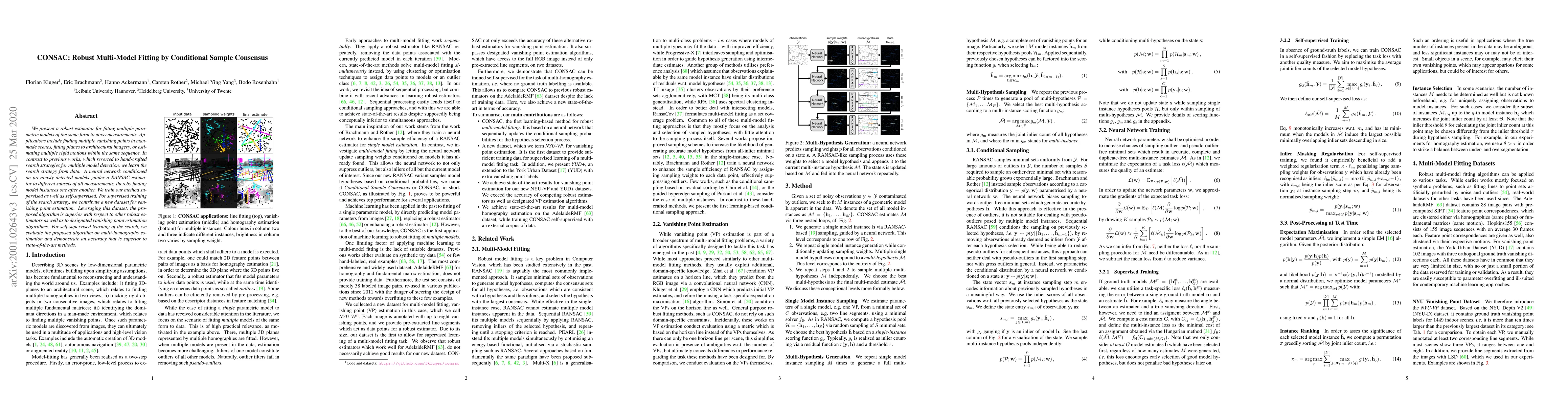 The paper introduces CONSAC, a neural network-guided robust estimator for fitting multiple parametric models from noisy data. It learns search strategies from data, improving upon previous hand-crafted methods. CONSAC outperforms existing robust estimators and specialized algorithms in vanishing point estimation using a new supervised dataset, and demonstrates superior accuracy in multi-homography estimation through self-supervised learning.