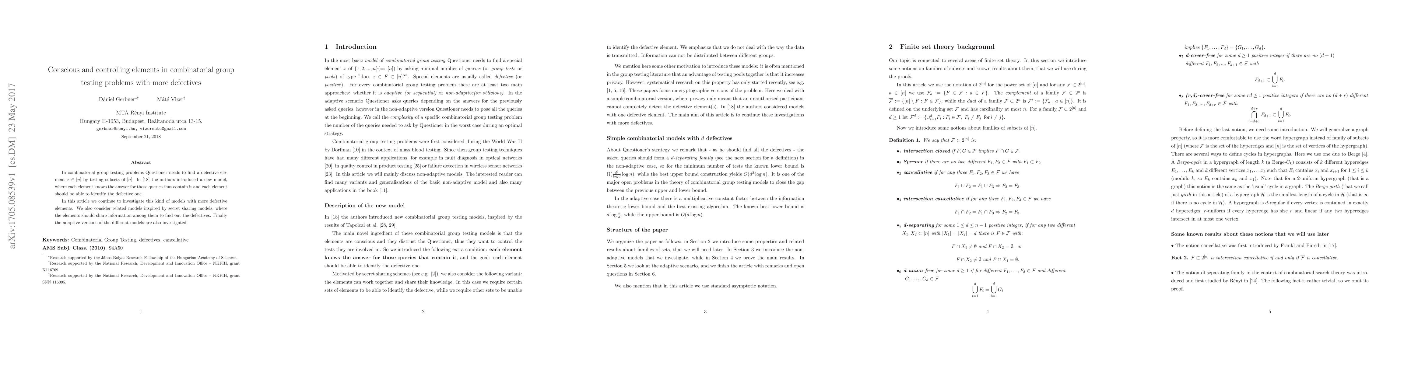 In combinatorial group testing problems Questioner needs to find a defective element $x\in [n]$ by testing subsets of $[n]$. In [18] the authors introduced a new model, where each element knows the answer for those queries that contain it and each element should be able to identify the defective one. In this article we continue to investigate this kind of models with more defective elements. We also consider related models inspired by secret sharing models, where the elements should share information among them to find out the defectives. Finally the adaptive versions of the different models are also investigated.