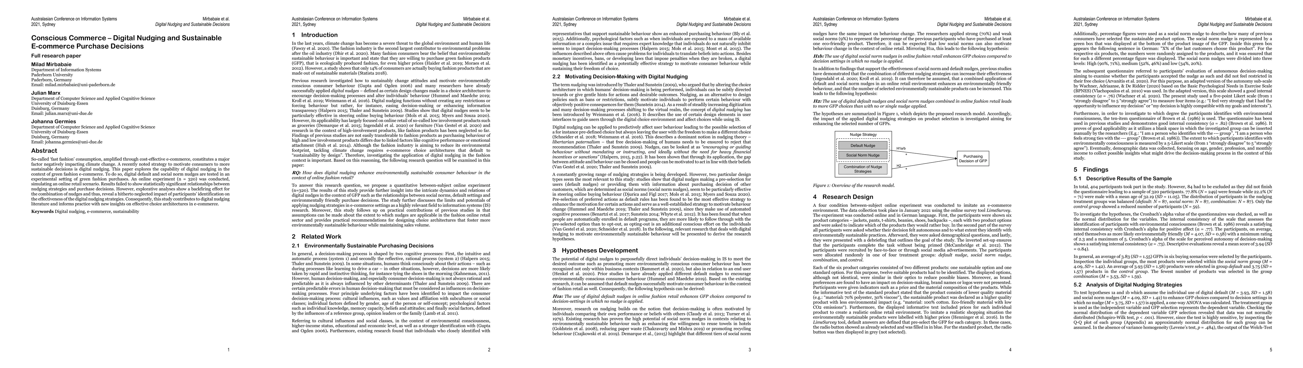 This paper investigates the effectiveness of digital nudging in promoting sustainable decisions in green fashion e-commerce, finding no significant impact from default or social norm nudges. Exploratory analyses reveal a backfiring effect, highlighting the importance of consumer identification for the success of nudging strategies.