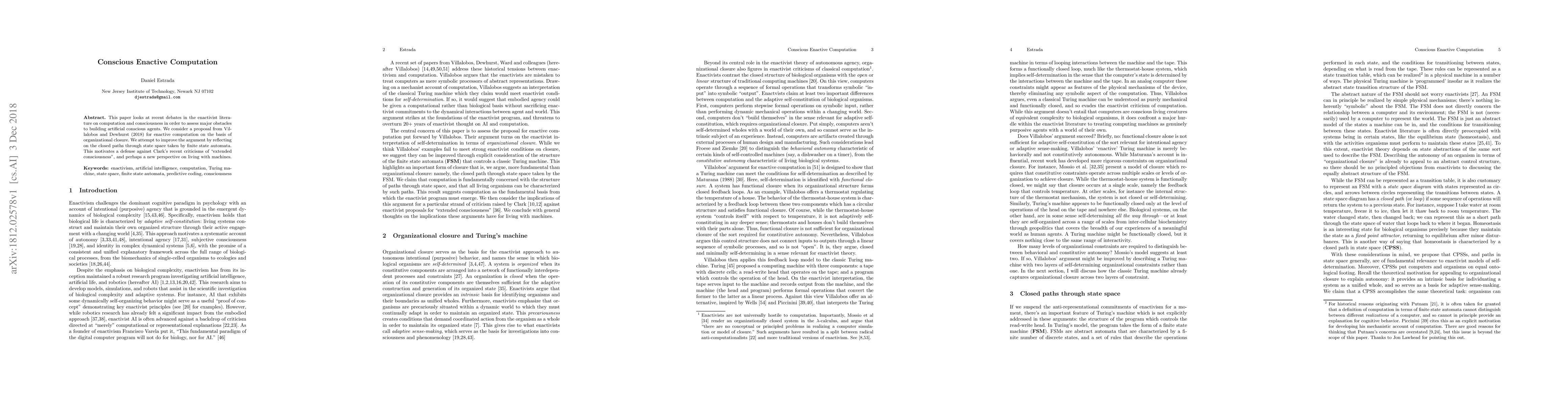 This paper looks at recent debates in the enactivist literature on computation and consciousness in order to assess major obstacles to building artificial conscious agents. We consider a proposal from Villalobos and Dewhurst (2018) for enactive computation on the basis of organizational closure. We attempt to improve the argument by reflecting on the closed paths through state space taken by finite state automata. This motivates a defense against Clark's recent criticisms of "extended consciousness", and perhaps a new perspective on living with machines.