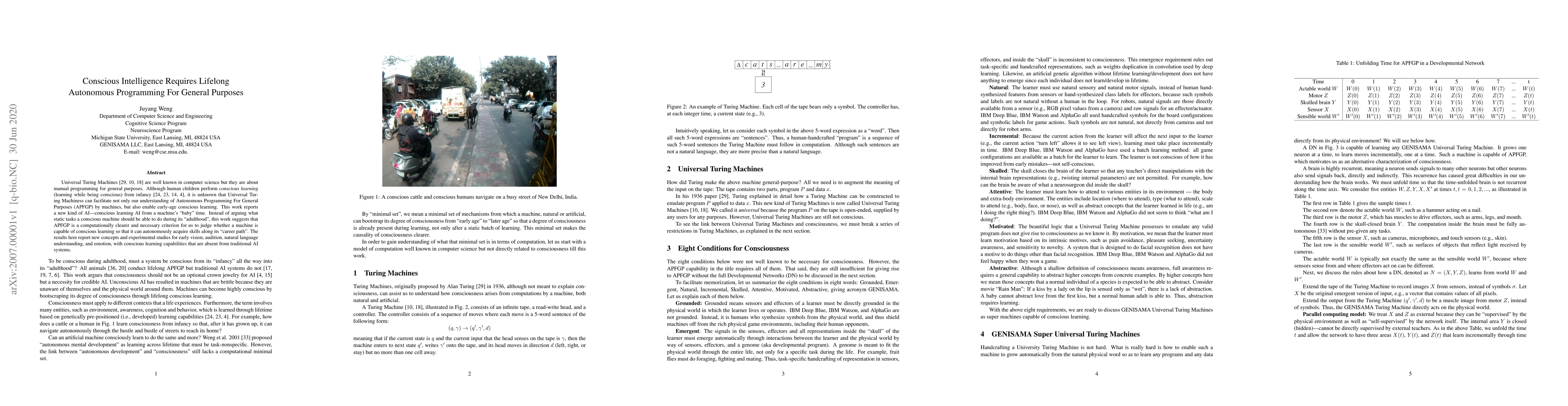 Universal Turing Machines [29, 10, 18] are well known in computer science but they are about manual programming for general purposes. Although human children perform conscious learning (i.e., learning while being conscious) from infancy [24, 23, 14, 4], it is unknown that Universal Turing Machiness can facilitate not only our understanding of Autonomous Programming For General Purposes (APFGP) by machines, but also enable early-age conscious learning. This work reports a new kind of AI---conscious learning AI from a machine's "baby" time. Instead of arguing what static tasks a conscious machine should be able to do during its "adulthood", this work suggests that APFGP is a computationally clearer and necessary criterion for us to judge whether a machine is capable of conscious learning so that it can autonomously acquire skills along its "career path". The results here report new concepts and experimental studies for early vision, audition, natural language understanding, and emotion, with conscious learning capabilities that are absent from traditional AI systems.