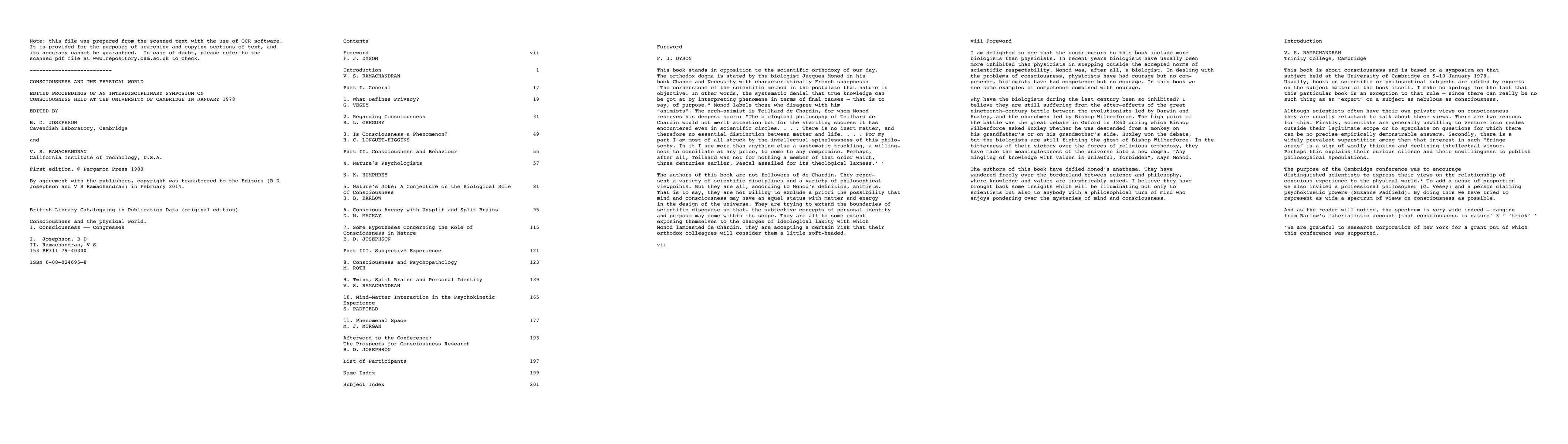 Edited proceedings of an interdisciplinary symposium on consciousness held at the University of Cambridge in January 1978. The purpose of the Cambridge conference was to encourage distinguished scientists to express their views on the relationship of conscious experience to the physical world.