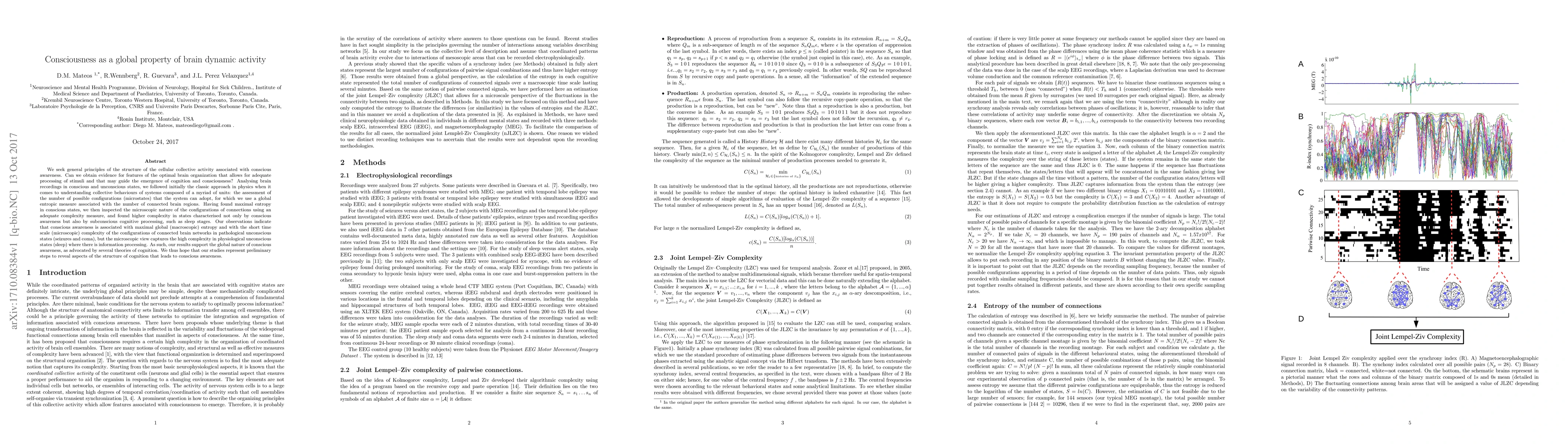 This paper investigates the relationship between consciousness and brain activity, finding that conscious awareness correlates with maximal global entropy and higher complexity in brain network configurations. The study supports the global nature of conscious awareness, suggesting that both conscious and subconscious states involve complex, yet different, brain dynamics.