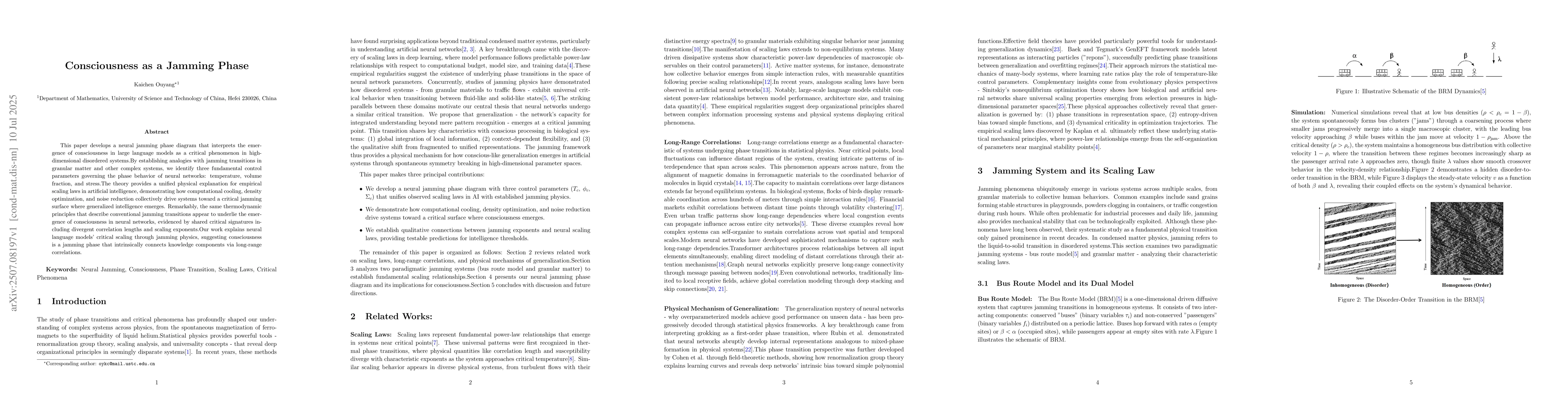 This paper develops a neural jamming phase diagram that interprets the emergence of consciousness in large language models as a critical phenomenon in high-dimensional disordered systems.By establishing analogies with jamming transitions in granular matter and other complex systems, we identify three fundamental control parameters governing the phase behavior of neural networks: temperature, volume fraction, and stress.The theory provides a unified physical explanation for empirical scaling laws in artificial intelligence, demonstrating how computational cooling, density optimization, and noise reduction collectively drive systems toward a critical jamming surface where generalized intelligence emerges. Remarkably, the same thermodynamic principles that describe conventional jamming transitions appear to underlie the emergence of consciousness in neural networks, evidenced by shared critical signatures including divergent correlation lengths and scaling exponents.Our work explains neural language models' critical scaling through jamming physics, suggesting consciousness is a jamming phase that intrinsically connects knowledge components via long-range correlations.