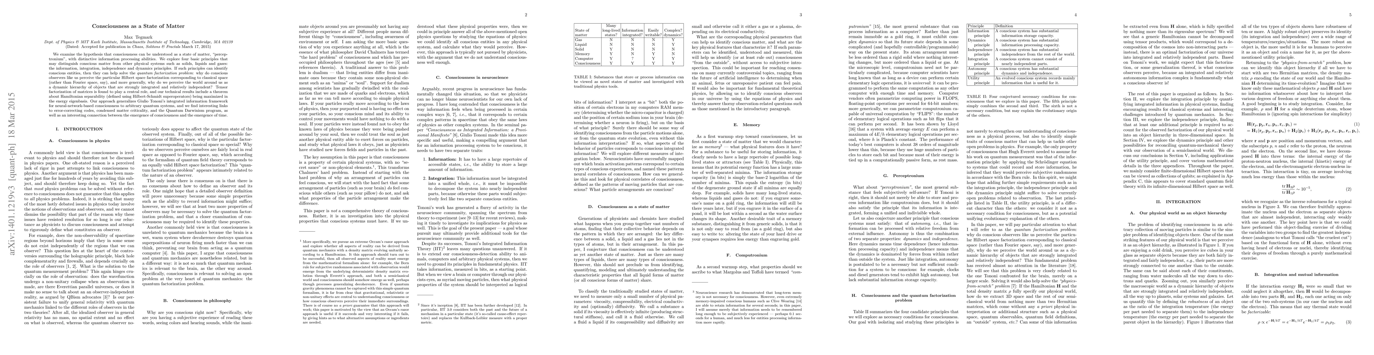 This paper proposes that consciousness can be viewed as a unique state of matter, termed "perceptronium," characterized by five principles that differentiate it from other physical systems. The authors explore how tensor factorization and Hamiltonian separability may explain why conscious observers perceive the world as a coherent hierarchy of objects.
