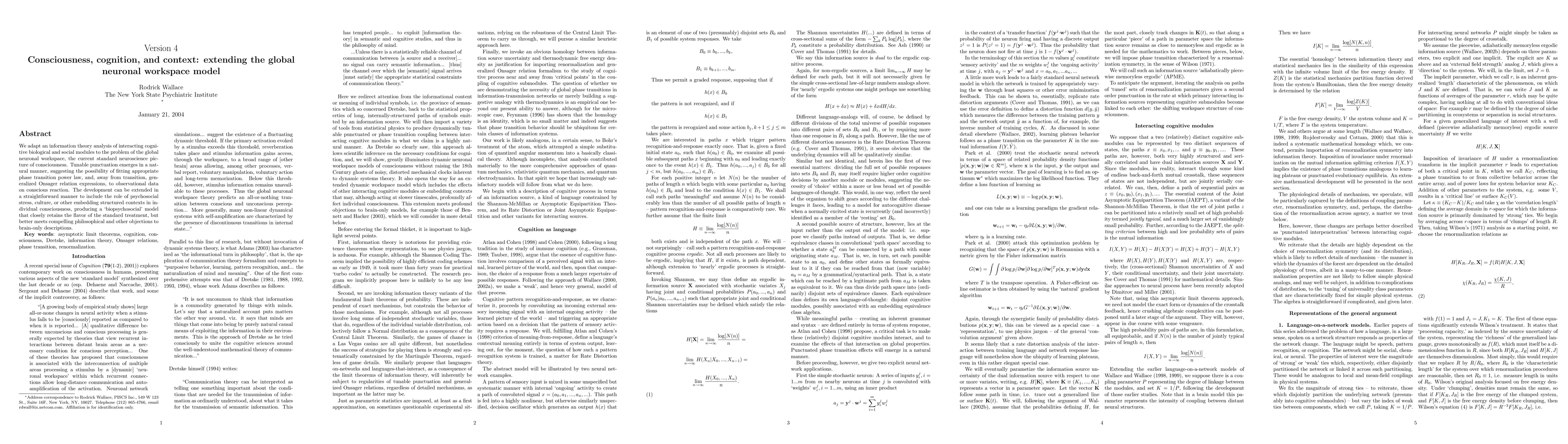 We adapt an information theory analysis of interacting cognitive biological and social modules to the problem of the global neuronal workspace, the current standard neuroscience picture of consciousness. Tunable punctuation emerges in a natural manner, suggesting the possibility of fitting appropriate phase transition power law, and, away from transition, generalized Onsager relation expressions, to observational data on conscious reaction. The development can be extended in a straightforward way to include the role of psychosocial stress, culture, or other embedding structured contexts in individual consciousness, producing a 'biopsychosocial' model that closely retains the flavor of the standard treatment, but better meets philosophical and other objections to brain-only descriptions.