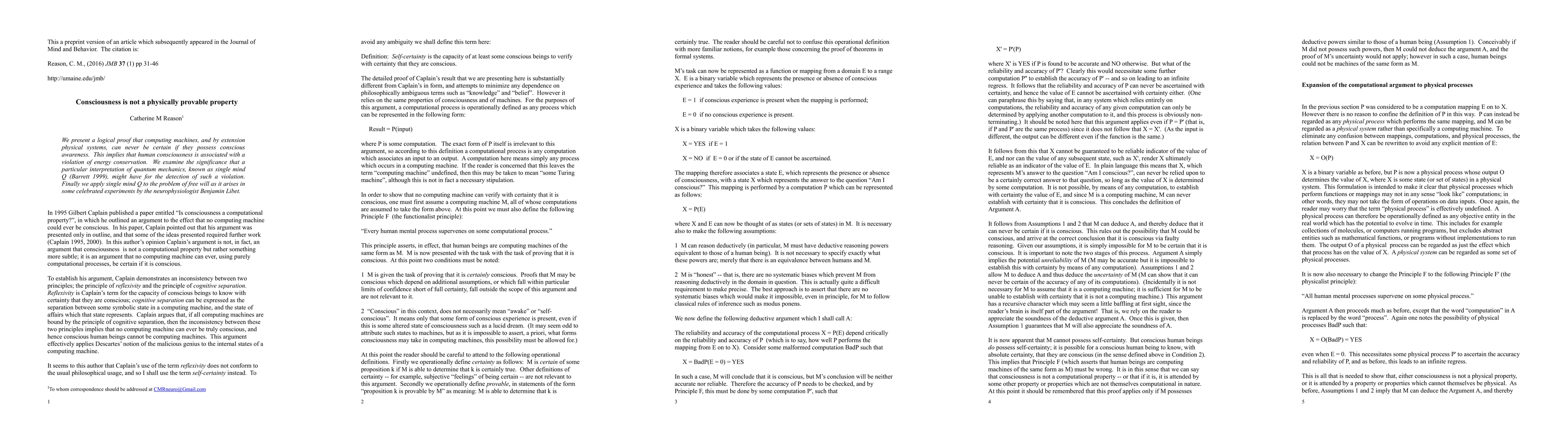 We present a logical proof that computing machines, and by extension physical systems, can never be certain if they possess conscious awareness. This implies that human consciousness is associated with a violation of energy conservation. We examine the significance that a particular interpretation of quantum mechanics, known as single mind Q (Barrett 1999), might have for the detection of such a violation. Finally we apply single mind Q to the problem of free will as it arises in some celebrated experiments by the neurophysiologist Benjamin Libet.