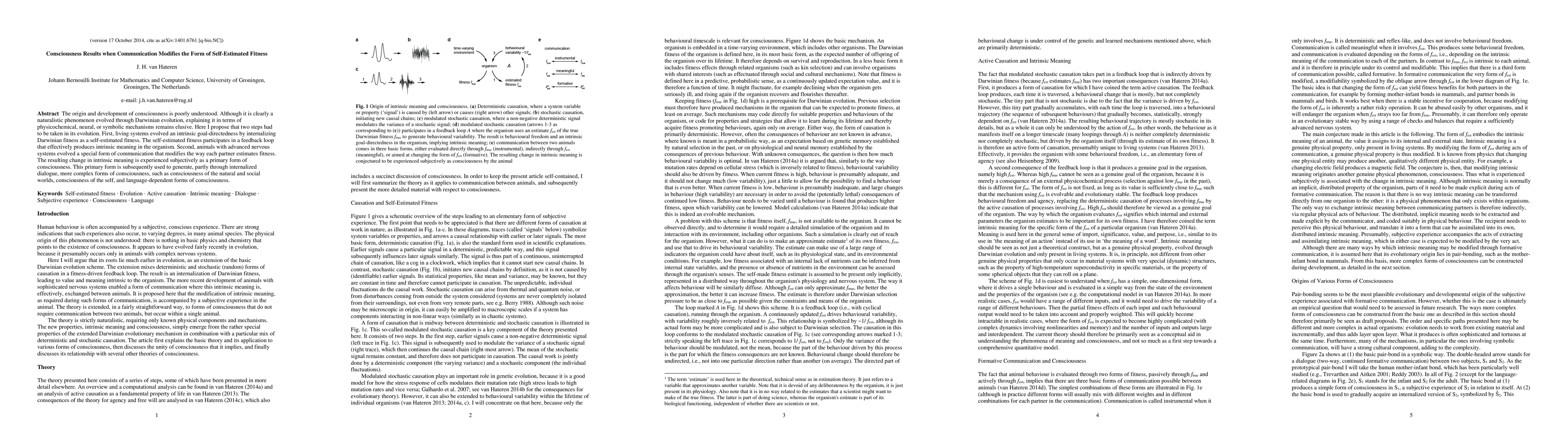 This paper proposes that consciousness arises from communication modifying self-estimated fitness, leading to intrinsic meaning and subjective experience. It suggests that intrinsic goal-directedness evolved first, followed by advanced communication in nervous systems that alters fitness estimation, resulting in primary consciousness.