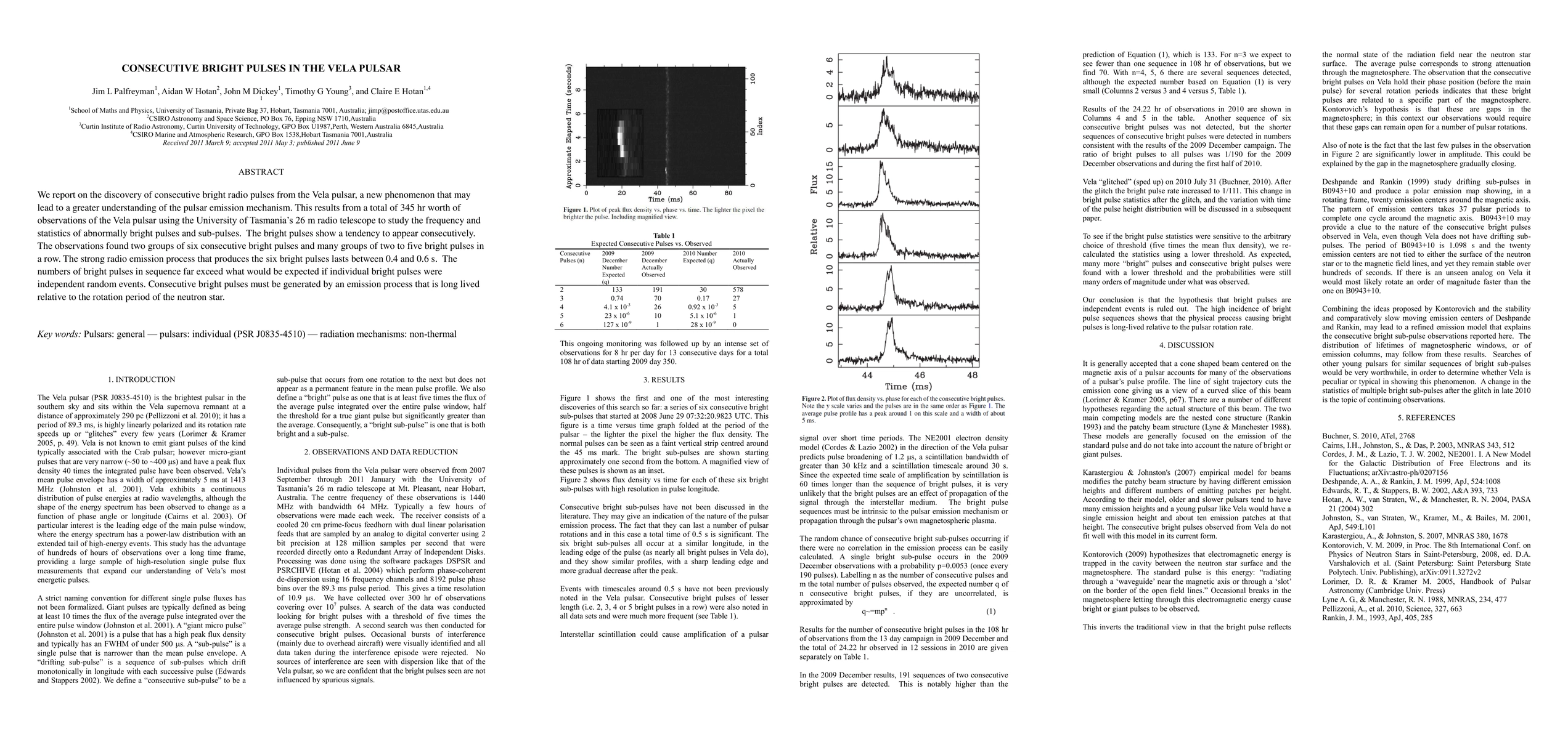 The discovery of consecutive bright radio pulses in the Vela pulsar suggests a new understanding of its emission mechanism, with observations revealing groups of up to six consecutive bright pulses, indicating a long-lived emission process. This phenomenon challenges the assumption of random occurrence of bright pulses.