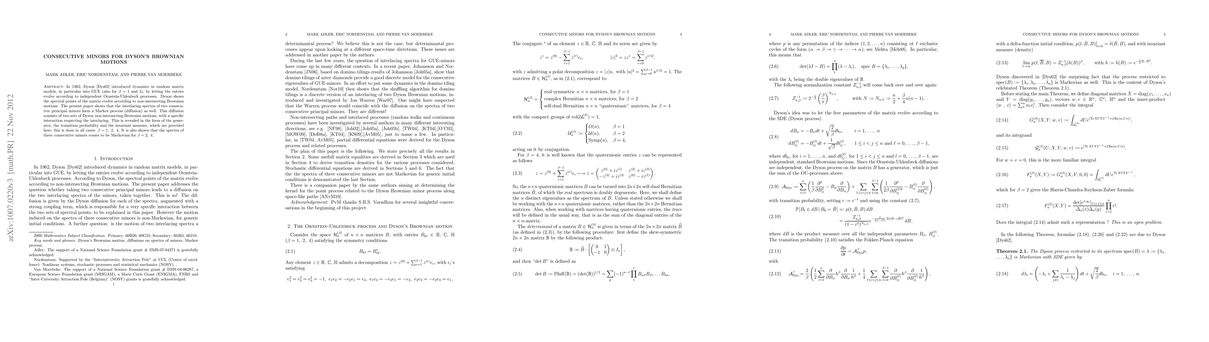 In 1962, Dyson introduced dynamics in random matrix models, in particular into GUE (also for beta=1 and 4), by letting the entries evolve according to independent Ornstein-Uhlenbeck processes. Dyson shows the spectral points of the matrix evolve according to non-intersecting Brownian motions. The present paper shows that the interlacing spectra of two consecutive principal minors form a Markov process (diffusion) as well. This diffusion consists of two sets of Dyson non-intersecting Brownian motions, with a specific interaction respecting the interlacing. This is revealed in the form of the generator, the transition probability and the invariant measure, which are provided here; this is done in all cases: beta=1,~2,~4. It is also shown that the spectra of three consecutive minors ceases to be Markovian for \beta=2,~4.