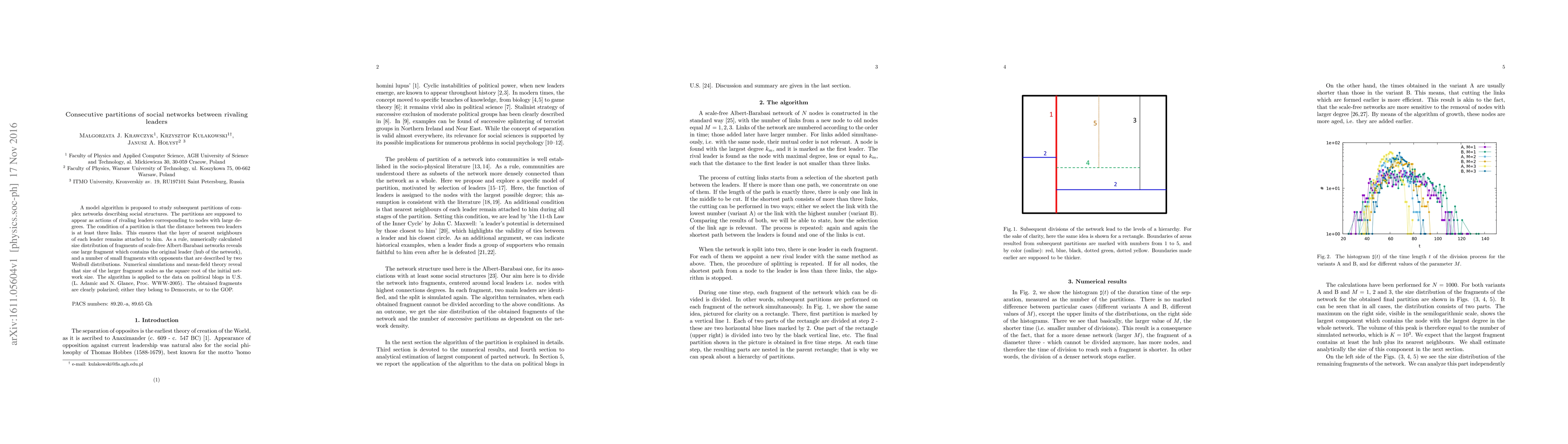 A model algorithm is proposed to study subsequent partitions of complex networks describing social structures. The partitions are supposed to appear as actions of rivaling leaders corresponding to nodes with large degrees. The condition of a partition is that the distance between two leaders is at least three links. This ensures that the layer of nearest neighbours of each leader remains attached to him. As a rule, numerically calculated size distribution of fragments of scale-free Albert-Barabasi networks reveals one large fragment which contains the original leader (hub of the network), and a number of small fragments with opponents that are described by two Weibull distributions. Numerical simulations and mean-field theory reveal that size of the larger fragment scales as the square root of the initial network size. The algorithm is applied to the data on political blogs in U.S. (L. Adamic and N. Glance, Proc. WWW-2005). The obtained fragments are clearly polarized; either they belong to Democrats, or to the GOP.