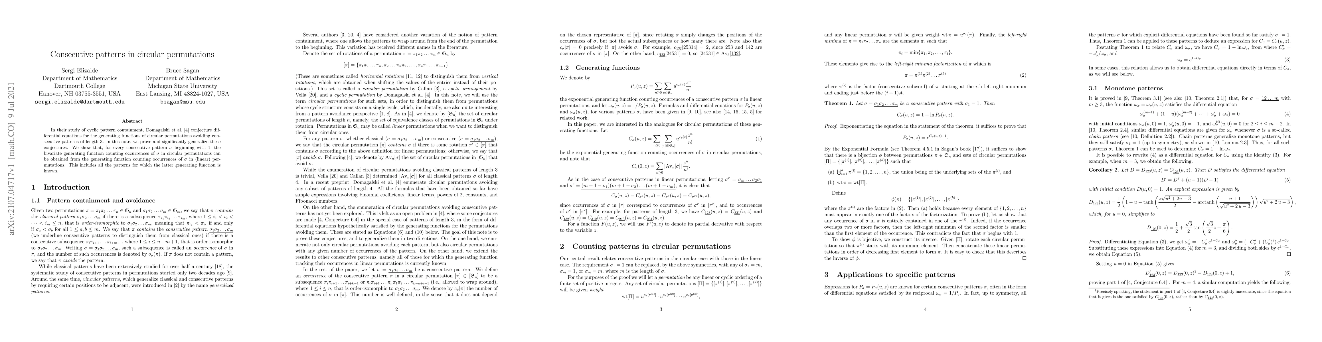 The paper presents a significant generalization of differential equations for generating functions of circular permutations avoiding consecutive patterns, linking linear and circular permutation patterns.