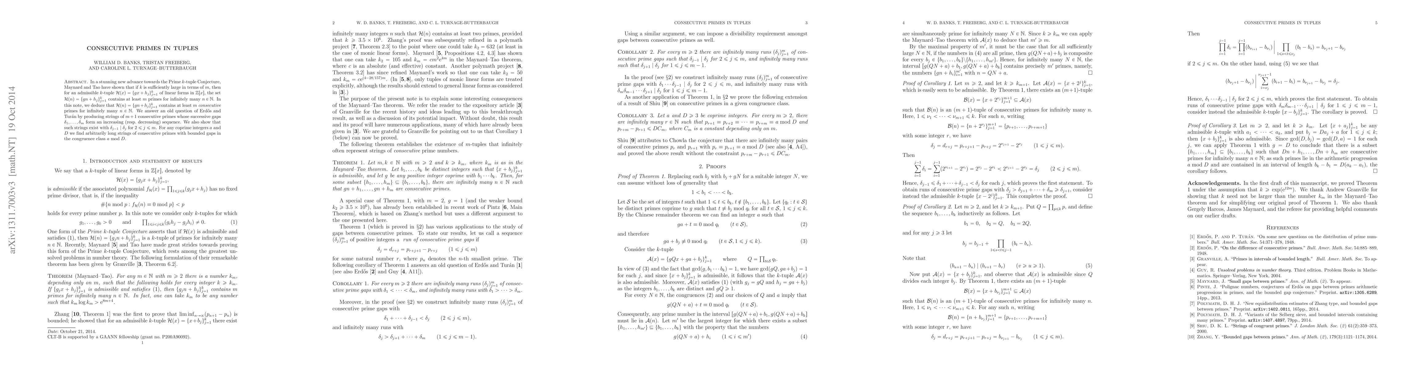 In a recent advance towards the Prime $k$-tuple Conjecture, Maynard and Tao have shown that if $k$ is sufficiently large in terms of $m$, then for an admissible $k$-tuple $\mathcal{H}(x) = \{gx + h_j\}_{j=1}^k$ of linear forms in $\mathbb{Z}[x]$, the set $\mathcal{H}(n) = \{gn + h_j\}_{j=1}^k$ contains at least $m$ primes for infinitely many $n \in \mathbb{N}$. In this note, we deduce that $\mathcal{H}(n) = \{gn + h_j\}_{j=1}^k$ contains at least $m$ consecutive primes for infinitely many $n \in \mathbb{N}$. We answer an old question of Erd\H os and Tur\'an by producing strings of $m + 1$ consecutive primes whose successive gaps $\delta_1,\ldots,\delta_m$ form an increasing (resp. decreasing) sequence. We also show that such strings exist with $\delta_{j-1} \mid \delta_j$ for $2 \le j \le m$. For any coprime integers $a$ and $D$ we find arbitrarily long strings of consecutive primes with bounded gaps in the congruence class $a \bmod D$.