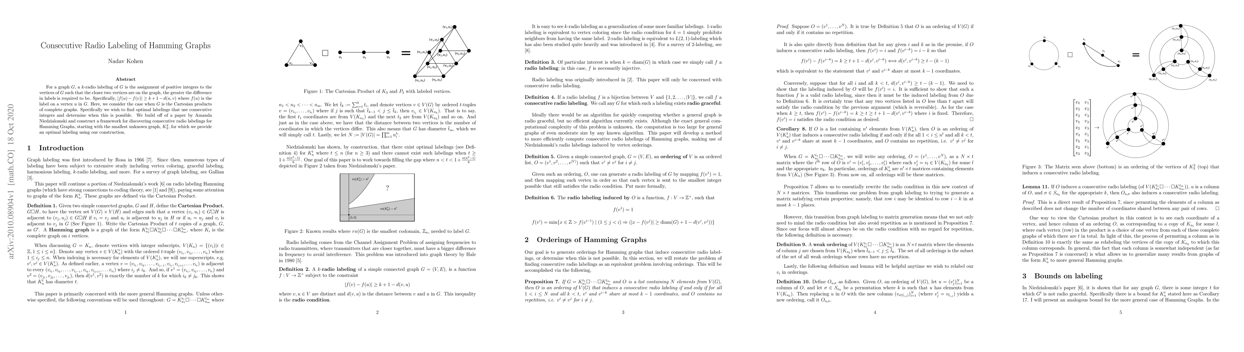 For a graph $G$, a $k$-radio labeling of $G$ is the assignment of positive integers to the vertices of $G$ such that the closer two vertices are on the graph, the greater the difference in labels is required to be. Specifically, $\vert f(u)-f(v)\vert\geq k + 1 - d(u,v)$ where $f(u)$ is the label on a vertex $u$ in $G$. Here, we consider the case when $G$ is the Cartesian products of complete graphs. Specifically we wish to find optimal labelings that use consecutive integers and determine when this is possible. We build off of a paper by Amanda Niedzialomski and construct a framework for discovering consecutive radio labelings for Hamming Graphs, starting with the smallest unknown graph, $K_3^4$, for which we provide an optimal labeling using our construction.