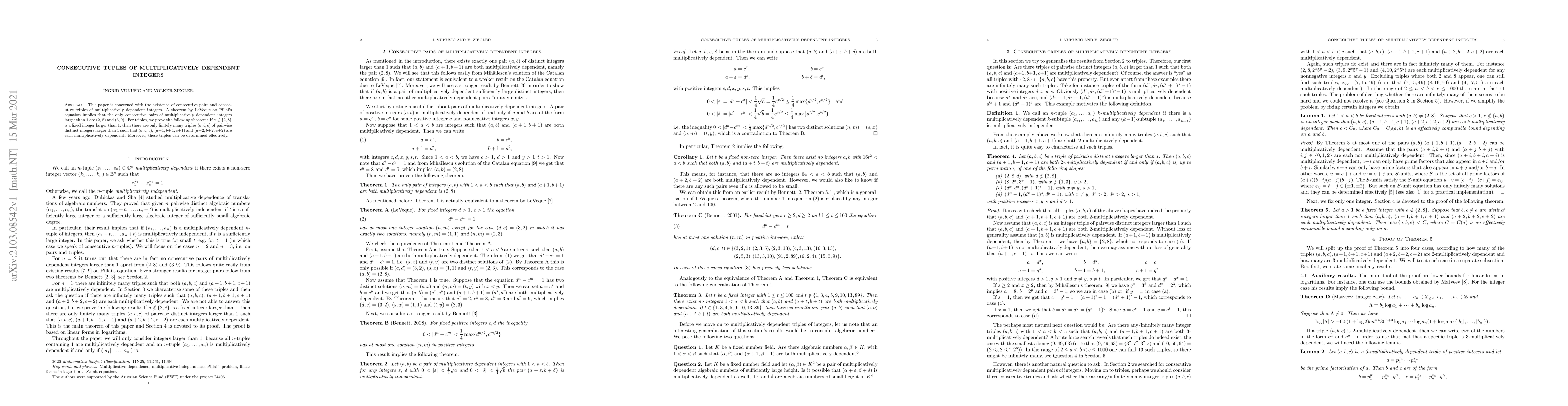 This paper is concerned with the existence of consecutive pairs and consecutive triples of multiplicatively dependent integers. A theorem by LeVeque on Pillai's equation implies that the only consecutive pairs of multiplicatively dependent integers larger than 1 are $(2,8)$ and $(3,9)$. For triples, we prove the following theorem: If $a\notin \{2,8\}$ is a fixed integer larger than 1, then there are only finitely many triples $(a,b,c)$ of pairwise distinct integers larger than 1 such that $(a,b,c)$, $(a+1,b+1,c+1)$ and $(a+2,b+2,c+2)$ are each multiplicatively dependent. Moreover, these triples can be determined effectively.