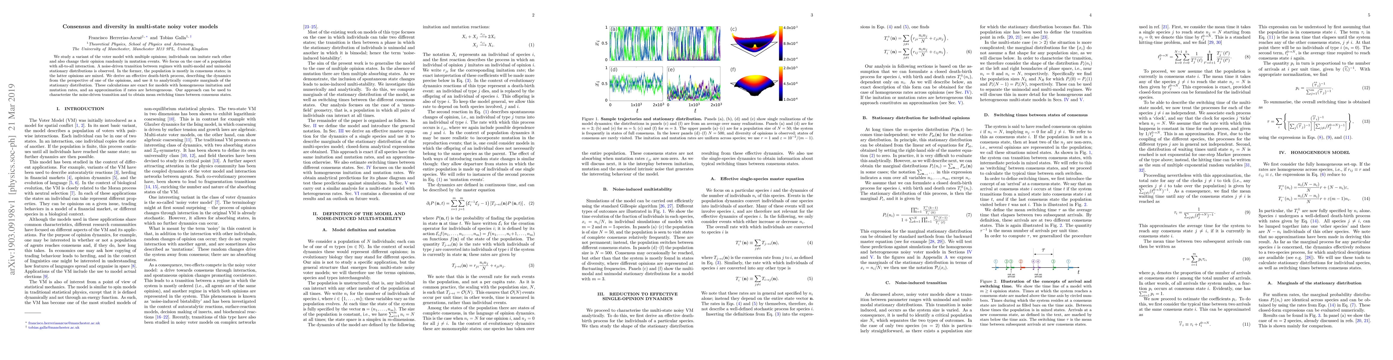 We study a variant of the voter model with multiple opinions; individuals can imitate each other and also change their opinion randomly in mutation events. We focus on the case of a population with all-to-all interaction. A noise-driven transition between regimes with multi-modal and unimodal stationary distributions is observed. In the former, the population is mostly in consensus states; in the latter opinions are mixed. We derive an effective death-birth process, describing the dynamics from the perspective of one of the opinions, and use it to analytically compute marginals of the stationary distribution. These calculations are exact for models with homogeneous imitation and mutation rates, and an approximation if rates are heterogeneous. Our approach can be used to characterize the noise-driven transition and to obtain mean switching times between consensus states.