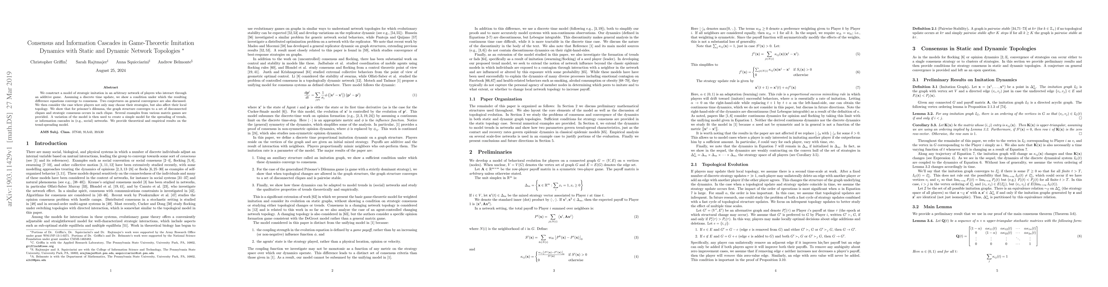 This paper develops a game-theoretic model of strategic imitation in networks, proving conditions for consensus convergence under static and dynamic topologies, and explores information cascades using a variation of the model, demonstrating trend spreading in social networks. It analyzes prisoner's dilemma and matrix games, showing consensus within disconnected cliques.