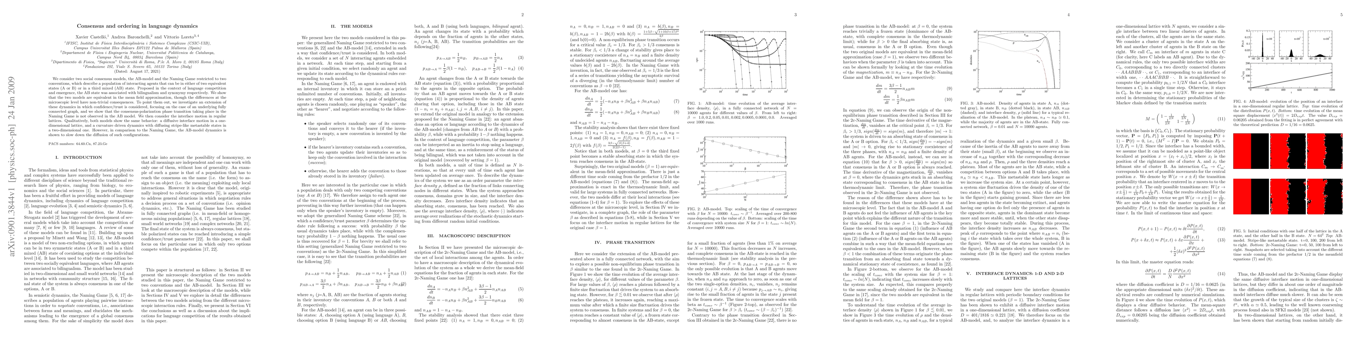 We consider two social consensus models, the AB-model and the Naming Game restricted to two conventions, which describe a population of interacting agents that can be in either of two equivalent states (A or B) or in a third mixed (AB) state. Proposed in the context of language competition and emergence, the AB state was associated with bilingualism and synonymy respectively. We show that the two models are equivalent in the mean field approximation, though the differences at the microscopic level have non-trivial consequences. To point them out, we investigate an extension of these dynamics in which confidence/trust is considered, focusing on the case of an underlying fully connected graph, and we show that the consensus-polarization phase transition taking place in the Naming Game is not observed in the AB model. We then consider the interface motion in regular lattices. Qualitatively, both models show the same behavior: a diffusive interface motion in a one-dimensional lattice, and a curvature driven dynamics with diffusing stripe-like metastable states in a two-dimensional one. However, in comparison to the Naming Game, the AB-model dynamics is shown to slow down the diffusion of such configurations.