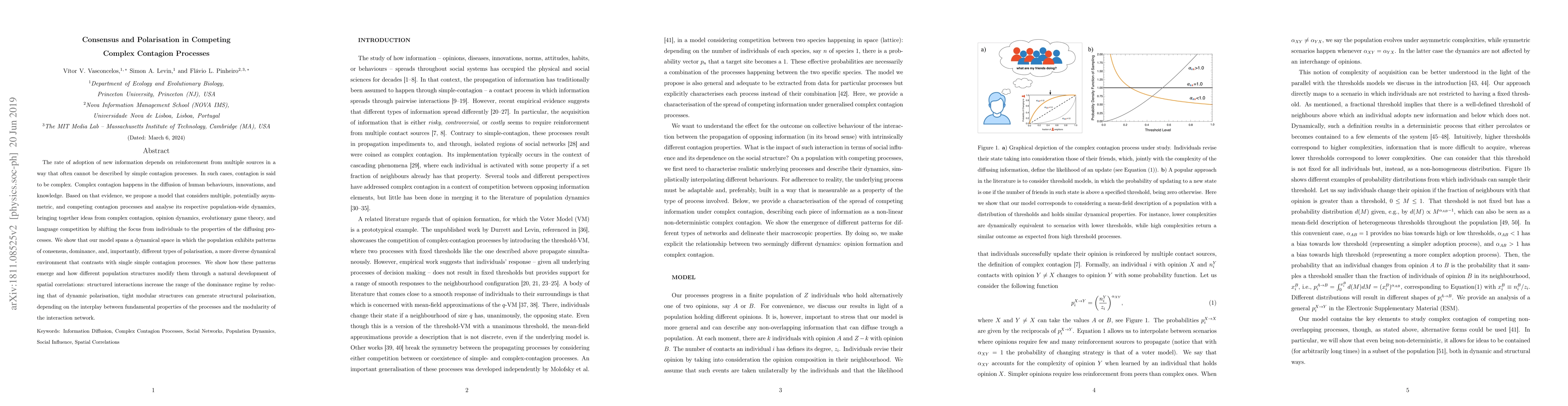 The rate of adoption of new information depends on reinforcement from multiple sources in a way that often cannot be described by simple contagion processes. In such cases, contagion is said to be complex. Complex contagion happens in the diffusion of human behaviours, innovations, and knowledge. Based on that evidence, we propose a model that considers multiple, potentially asymmetric, and competing contagion processes and analyse its respective population-wide dynamics, bringing together ideas from complex contagion, opinion dynamics, evolutionary game theory, and language competition by shifting the focus from individuals to the properties of the diffusing processes. We show that our model spans a dynamical space in which the population exhibits patterns of consensus, dominance, and, importantly, different types of polarisation, a more diverse dynamical environment that contrasts with single simple contagion processes. We show how these patterns emerge and how different population structures modify them through a natural development of spatial correlations: structured interactions increase the range of the dominance regime by reducing that of dynamic polarisation, tight modular structures can generate structural polarisation, depending on the interplay between fundamental properties of the processes and the modularity of the interaction network.