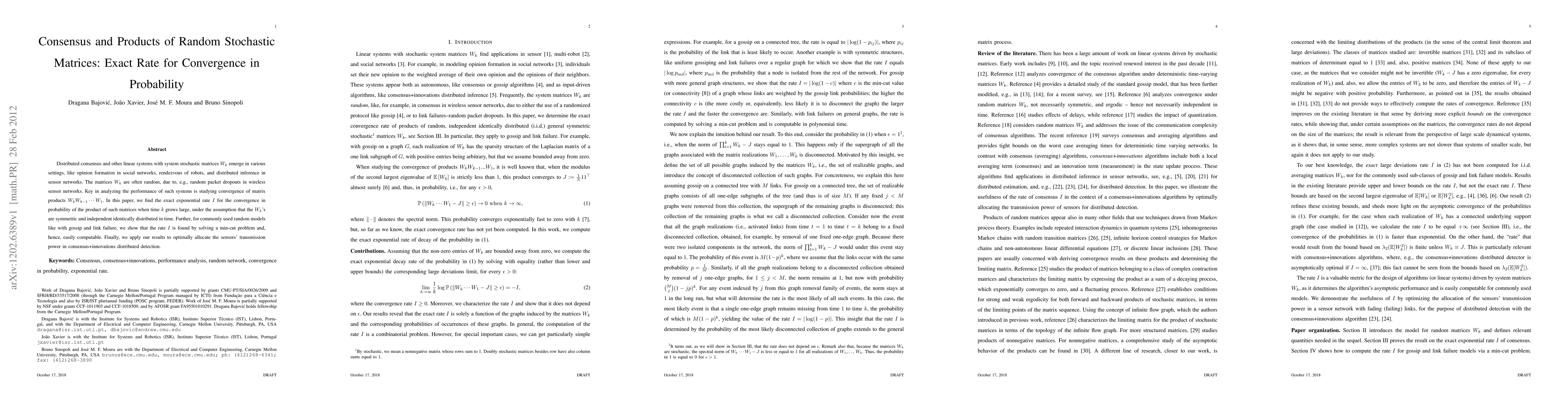 This paper examines the convergence rate of products of random stochastic matrices in distributed consensus systems, revealing an exact exponential rate $I$ for large time $k$. It demonstrates that this rate can be computed via a min-cut problem for specific random models, and applies these findings to optimize sensor transmission power in distributed detection systems.