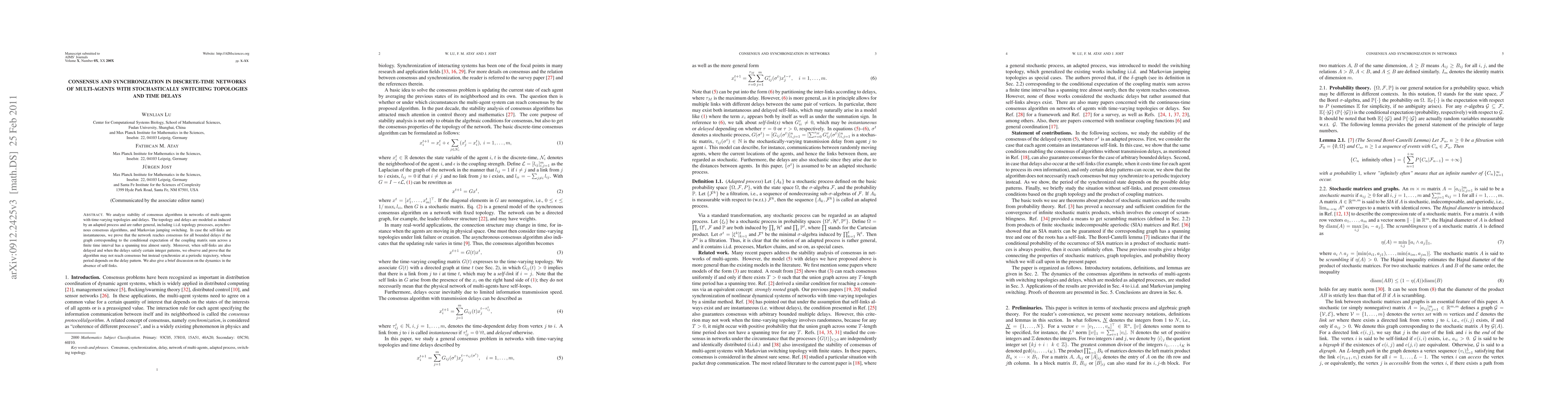 This paper investigates consensus algorithms in multi-agent networks with stochastically switching topologies and time delays, proving that consensus is achievable under certain conditions but synchronization may occur under specific delay patterns. The study also considers scenarios without self-links.