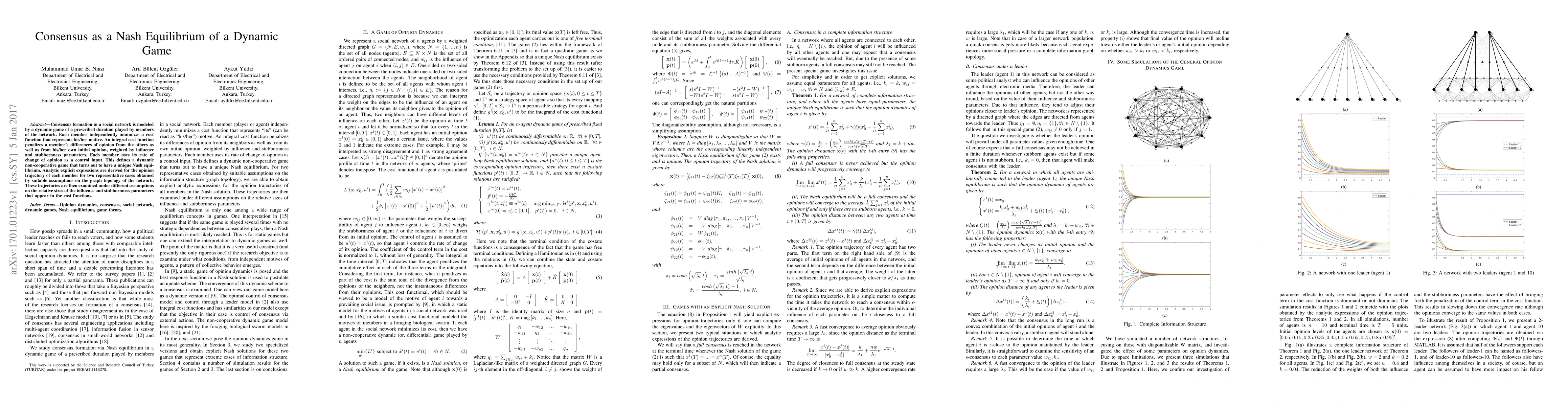 This paper models consensus formation in social networks as a dynamic non-cooperative game, demonstrating that it has a unique Nash equilibrium. Explicit expressions for opinion trajectories are derived under specific network topology assumptions and analyzed based on influence and stubbornness parameters.