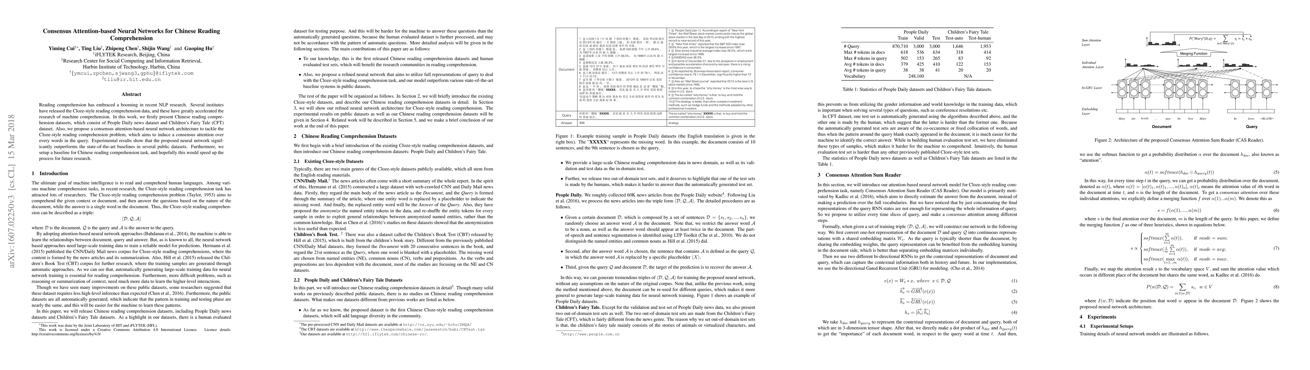 This paper introduces Chinese reading comprehension datasets and proposes a consensus attention-based neural network architecture to enhance Cloze-style reading comprehension. The proposed model significantly outperforms existing methods on public datasets, establishing a new baseline for future research in this area.