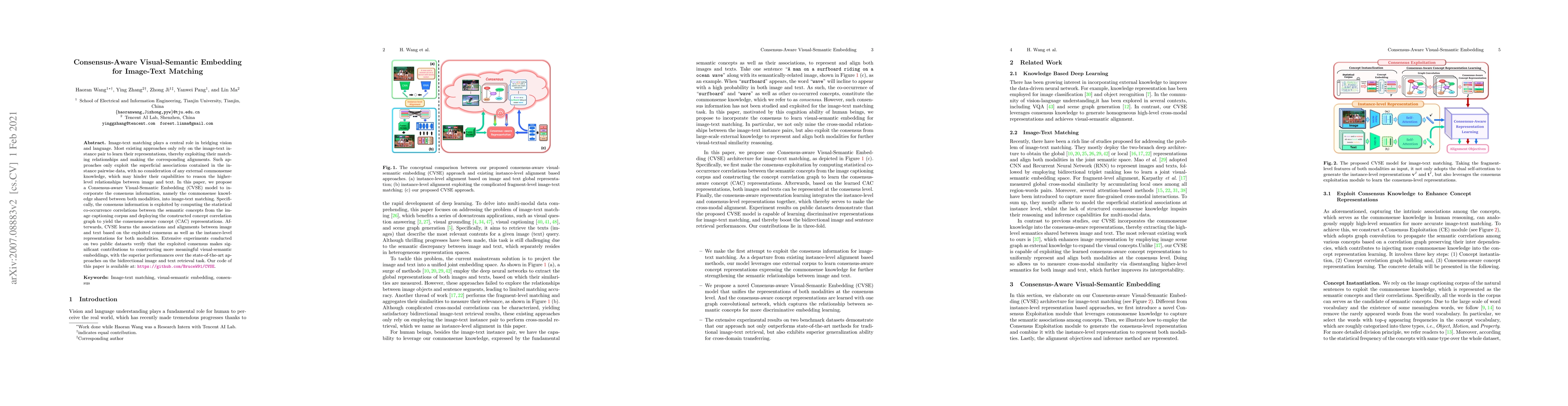 This paper introduces a Consensus-aware Visual-Semantic Embedding (CVSE) model to enhance image-text matching by incorporating commonsense knowledge. The CVSE model leverages statistical co-occurrence correlations between semantic concepts and constructs a concept correlation graph to generate consensus-aware concept representations, leading to improved performance over state-of-the-art methods in image-text retrieval tasks.