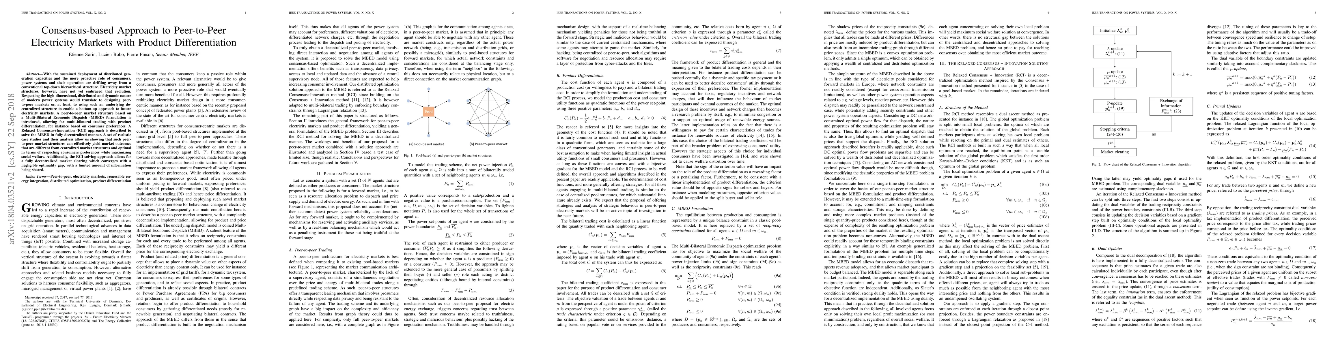 This paper introduces a consensus-based peer-to-peer electricity market structure using Multi-Bilateral Economic Dispatch (MBED) to accommodate product differentiation based on consumer preferences. The Relaxed Consensus+Innovation (RCI) approach enables fully decentralized market clearing that converges with minimal optimality gap, optimizing social welfare while respecting consumer choices.