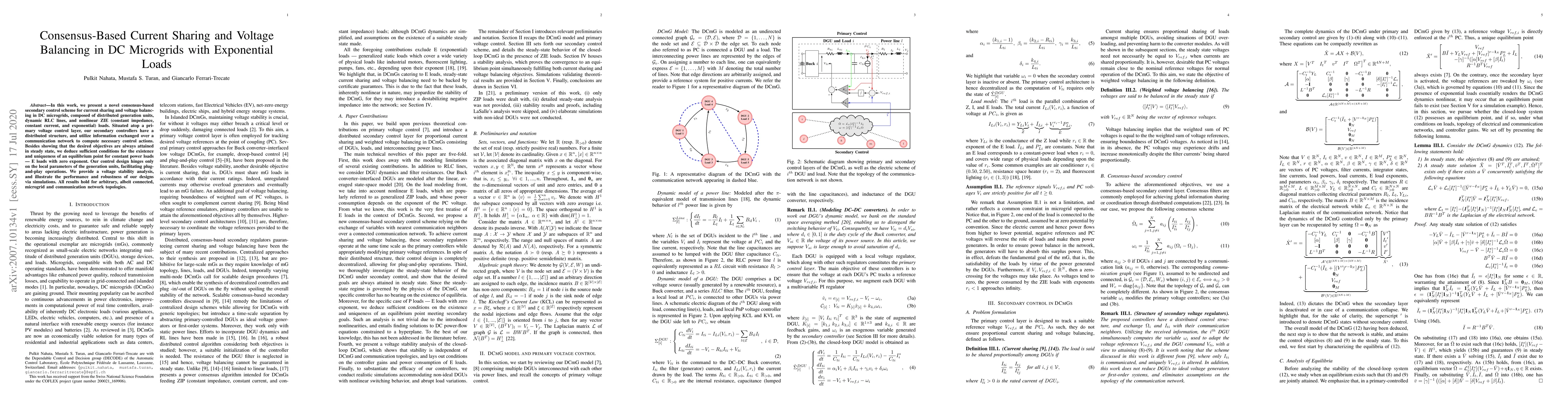 This paper proposes a consensus-based secondary control scheme for current sharing and voltage balancing in DC microgrids with exponential loads. The control design, which relies on local parameters, ensures plug-and-play operations and is validated through simulations for various network topologies.