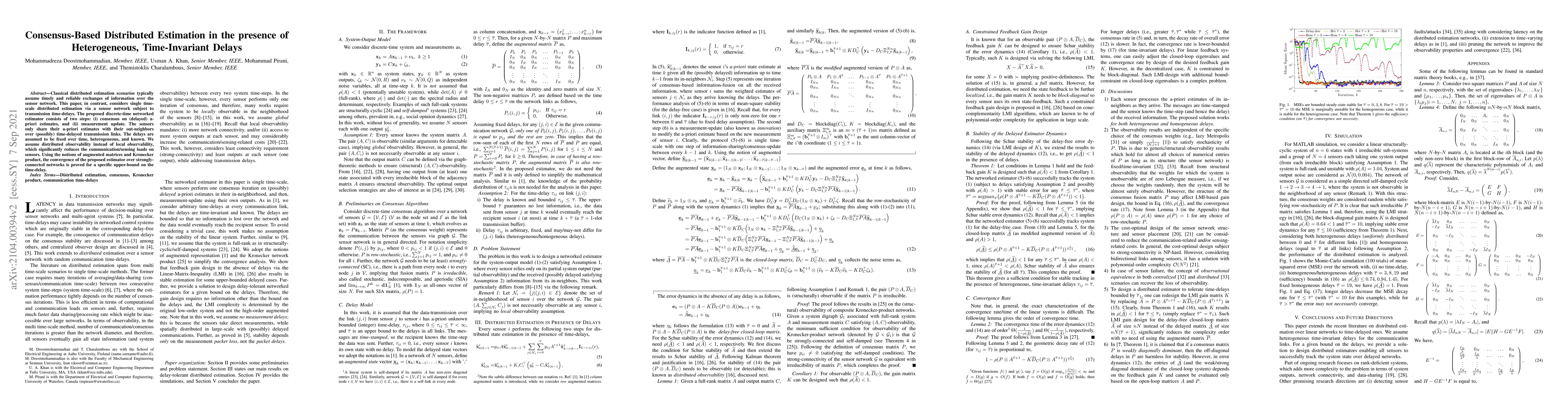 This paper proposes a consensus-based distributed estimator for sensor networks with heterogeneous, time-invariant delays, focusing on a-priori estimates and measurement updates. It proves convergence for a specific delay bound using augmented matrices and Kronecker products, assuming distributed observability.