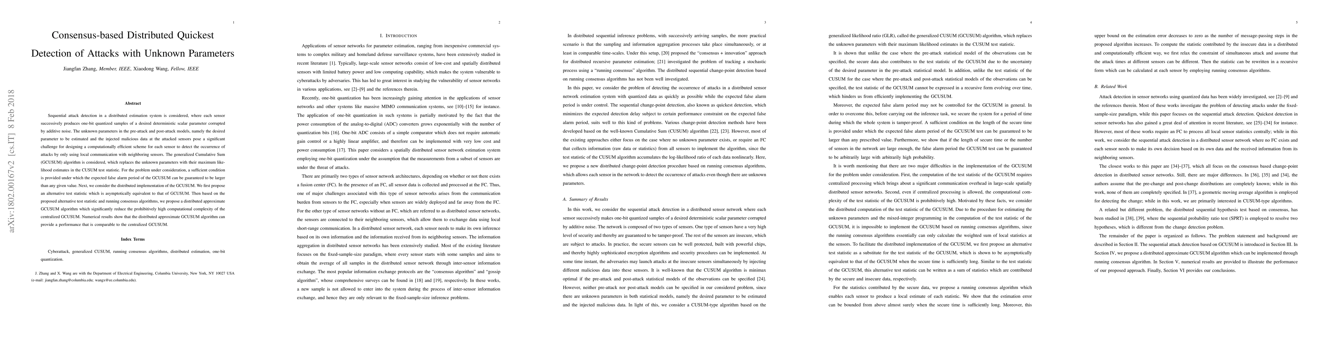 This paper proposes a distributed quickest detection scheme for attacks in a sensor network using the generalized Cumulative Sum (GCUSUM) algorithm. It introduces a distributed approximate GCUSUM algorithm that reduces computational complexity while maintaining comparable detection performance to the centralized version.