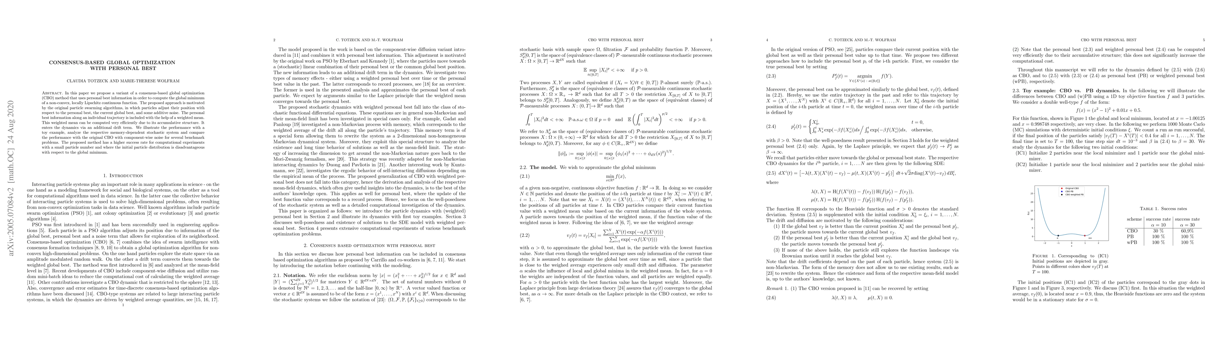 This paper introduces a modified consensus-based global optimization method that incorporates personal best information to find the global minimum of non-convex functions. The approach, inspired by particle swarming, uses an efficient accumulative weighted mean and shows improved success rates in computational experiments, especially with fewer particles and disadvantageous initial distributions.