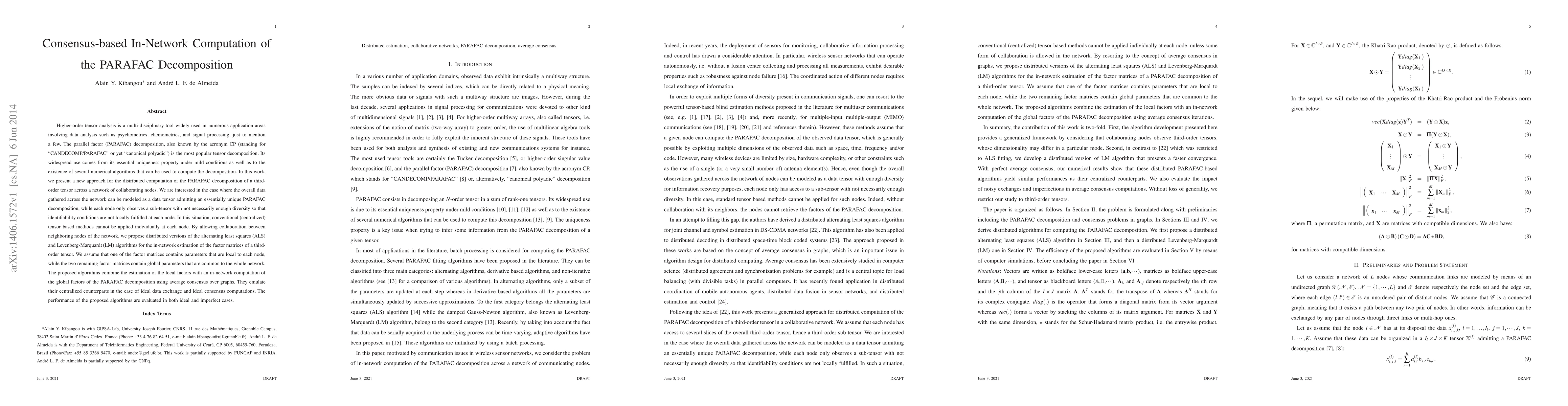 This paper presents distributed algorithms for computing the PARAFAC decomposition of a tensor across a network, allowing nodes to collaborate to estimate global factors while maintaining local parameters. The proposed methods use consensus-based in-network computation to achieve this, evaluating their performance under ideal and imperfect conditions.