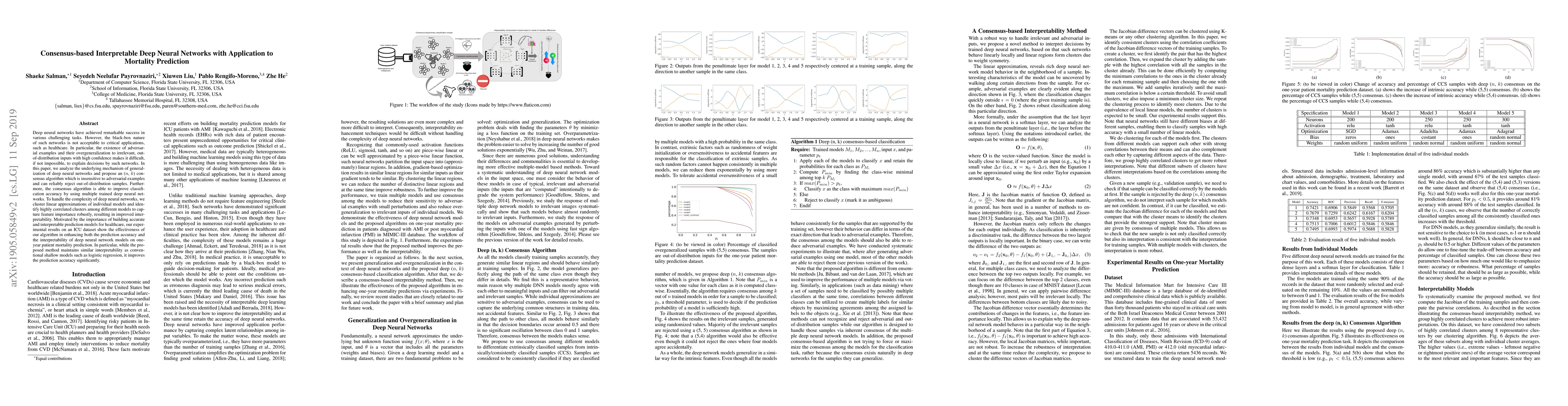 This paper proposes a consensus-based interpretable deep neural network algorithm to enhance mortality prediction in healthcare, addressing the black-box nature of traditional deep networks. The method improves accuracy and interpretability by clustering linear approximations and rejecting out-of-distribution samples, demonstrating effectiveness on an ICU dataset.