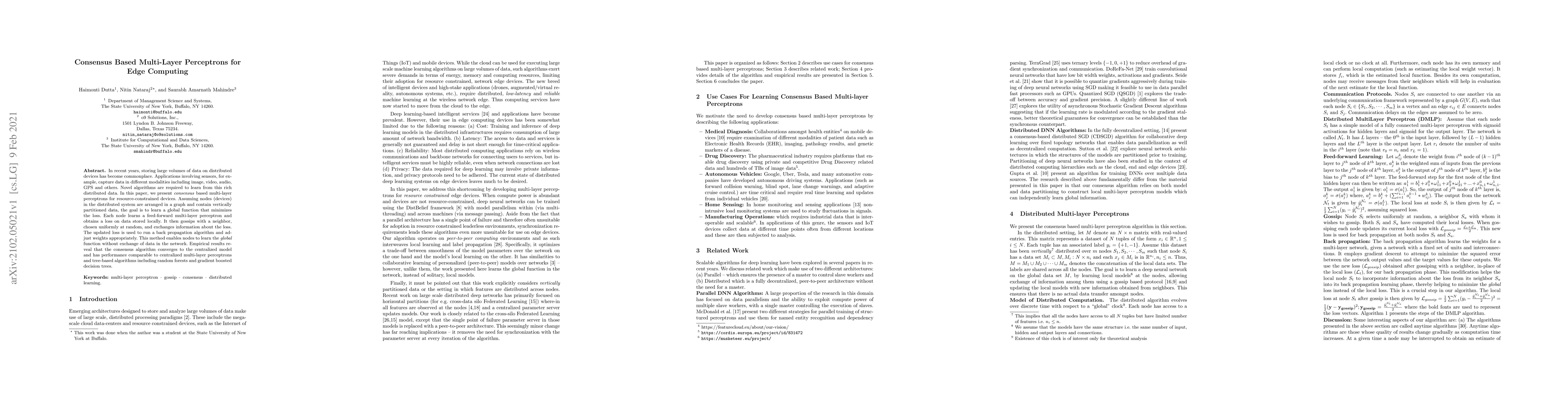 This paper proposes consensus-based multi-layer perceptrons for edge computing to enable distributed learning on resource-constrained devices without data exchange. The method converges to centralized models and performs comparably to tree-based algorithms.