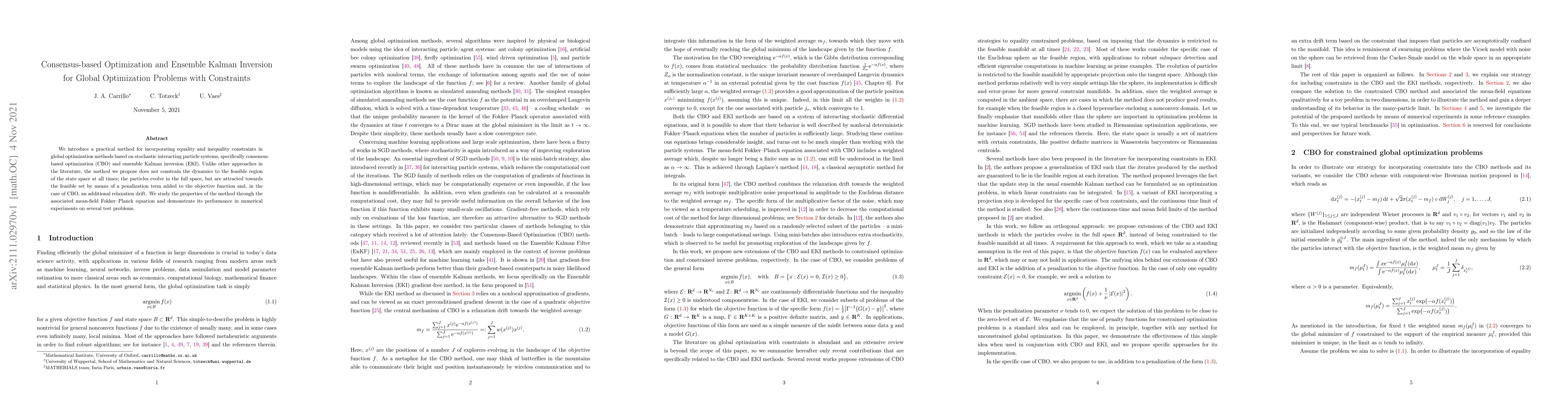 This paper proposes a method for solving global optimization problems with constraints using consensus-based optimization and ensemble Kalman inversion, allowing particles to evolve freely before being drawn towards the feasible set through penalization terms.