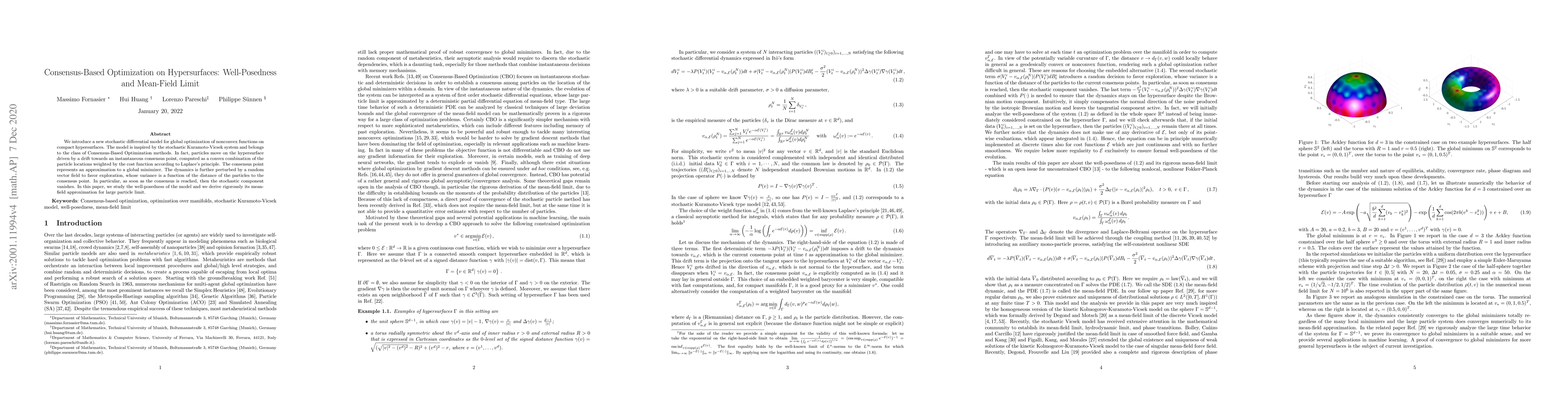 We introduce a new stochastic differential model for global optimization of nonconvex functions on compact hypersurfaces. The model is inspired by the stochastic Kuramoto-Vicsek system and belongs to the class of Consensus-Based Optimization methods. In fact, particles move on the hypersurface driven by a drift towards an instantaneous consensus point, computed as a convex combination of the particle locations weighted by the cost function according to Laplace's principle. The consensus point represents an approximation to a global minimizer. The dynamics is further perturbed by a random vector field to favor exploration, whose variance is a function of the distance of the particles to the consensus point. In particular, as soon as the consensus is reached, then the stochastic component vanishes. In this paper, we study the well-posedness of the model and we derive rigorously its mean-field approximation for large particle limit.